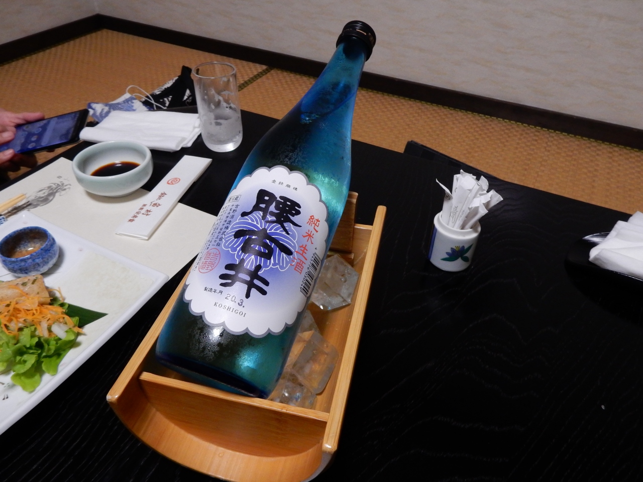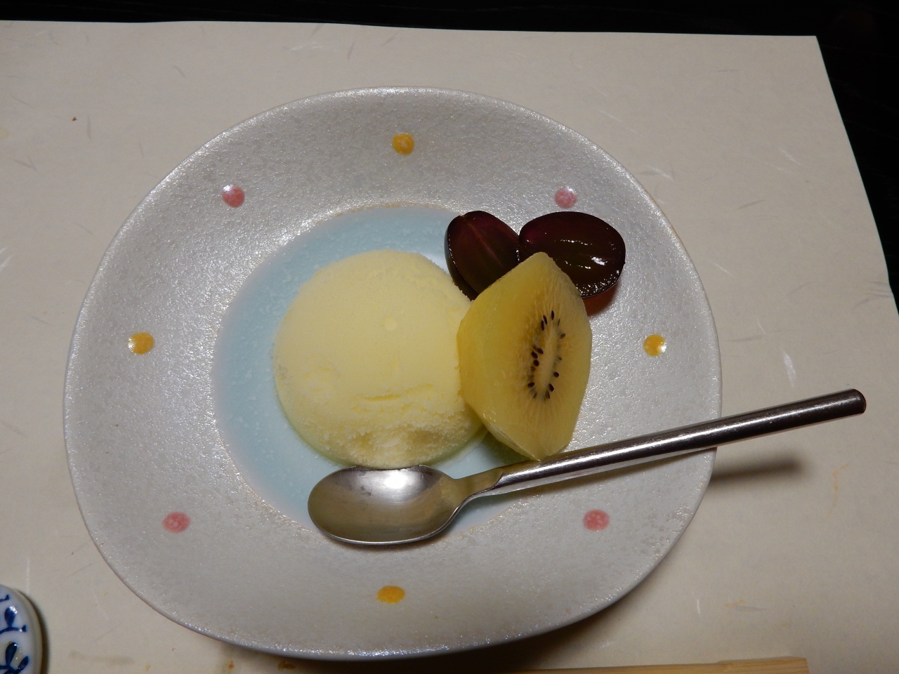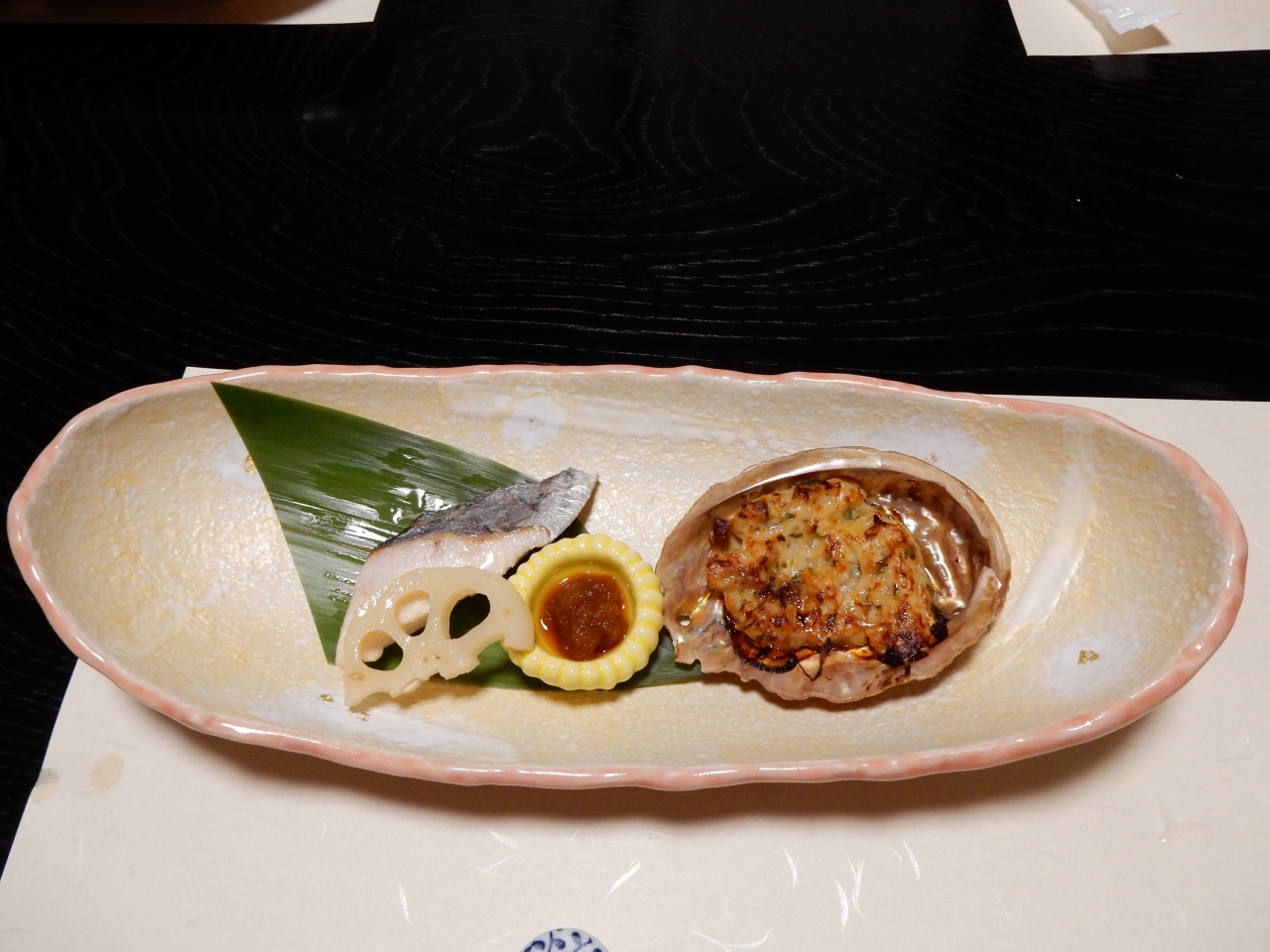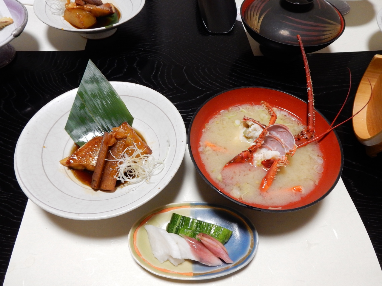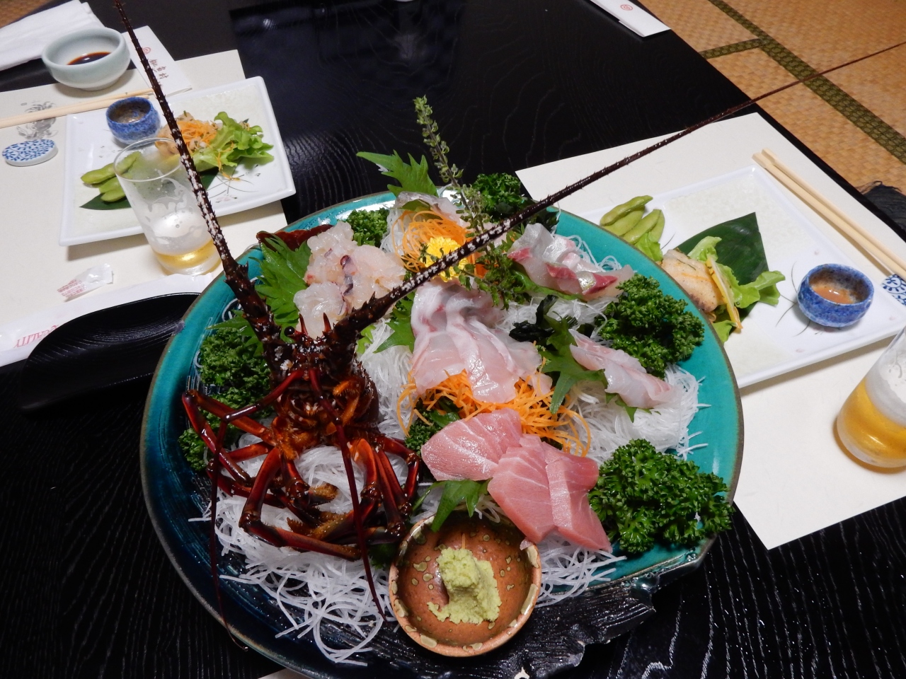 地元特産の伊勢海老や地魚を使った刺身の盛り合わせを始め、旬の太刀魚などを使った焼物、揚げ物、煮物、デザートに地元の柚子を使ったシャーベットがゆっくりながらもタイミングよく提供されて、美味しい料理を十分に楽しむことが出来ました。