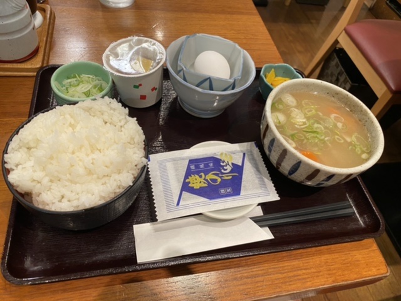食べたのはトン汁定食570円!トン汁にご飯、焼き海苔、生卵、納豆、漬物です。ご飯は大盛無料でナイスです(^^)