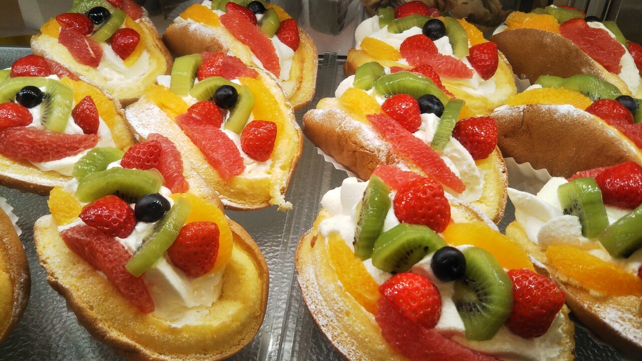 カステラ生地にクリームと、色合いのいいフルーツ。