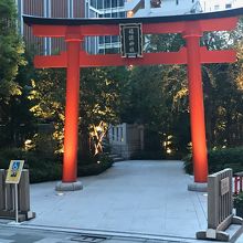 ビルの谷間に赤い鳥居があります。