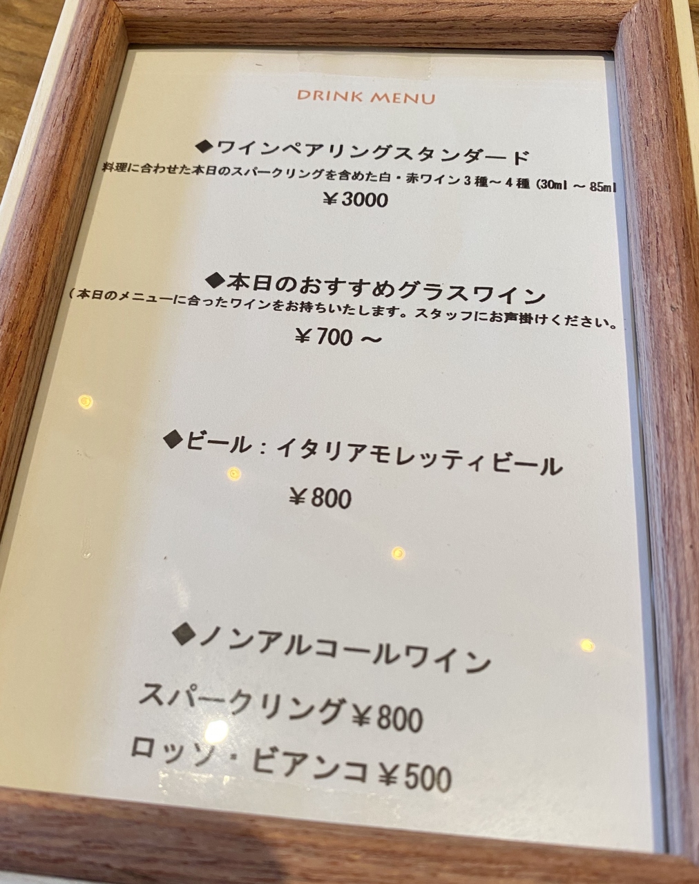 グラスワインは700円から。ワインペアリング(3から4種類)は3,000円とコチラもお安いです。