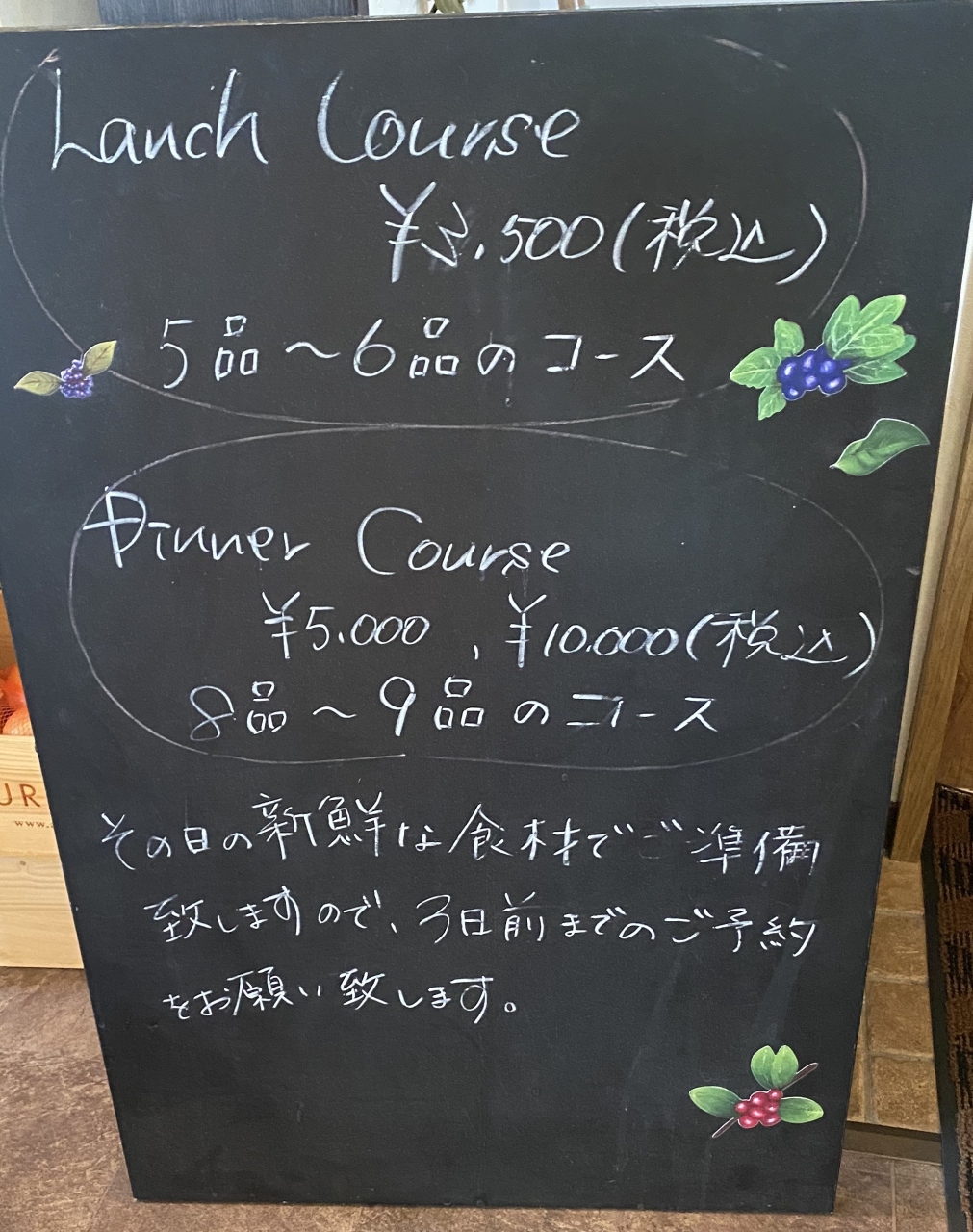 ちなみに現在のランチコースは1,500円(パスタコース)、3,500円(5から6品)。ディナーコース(8から9品)は5,000円、10,000円。