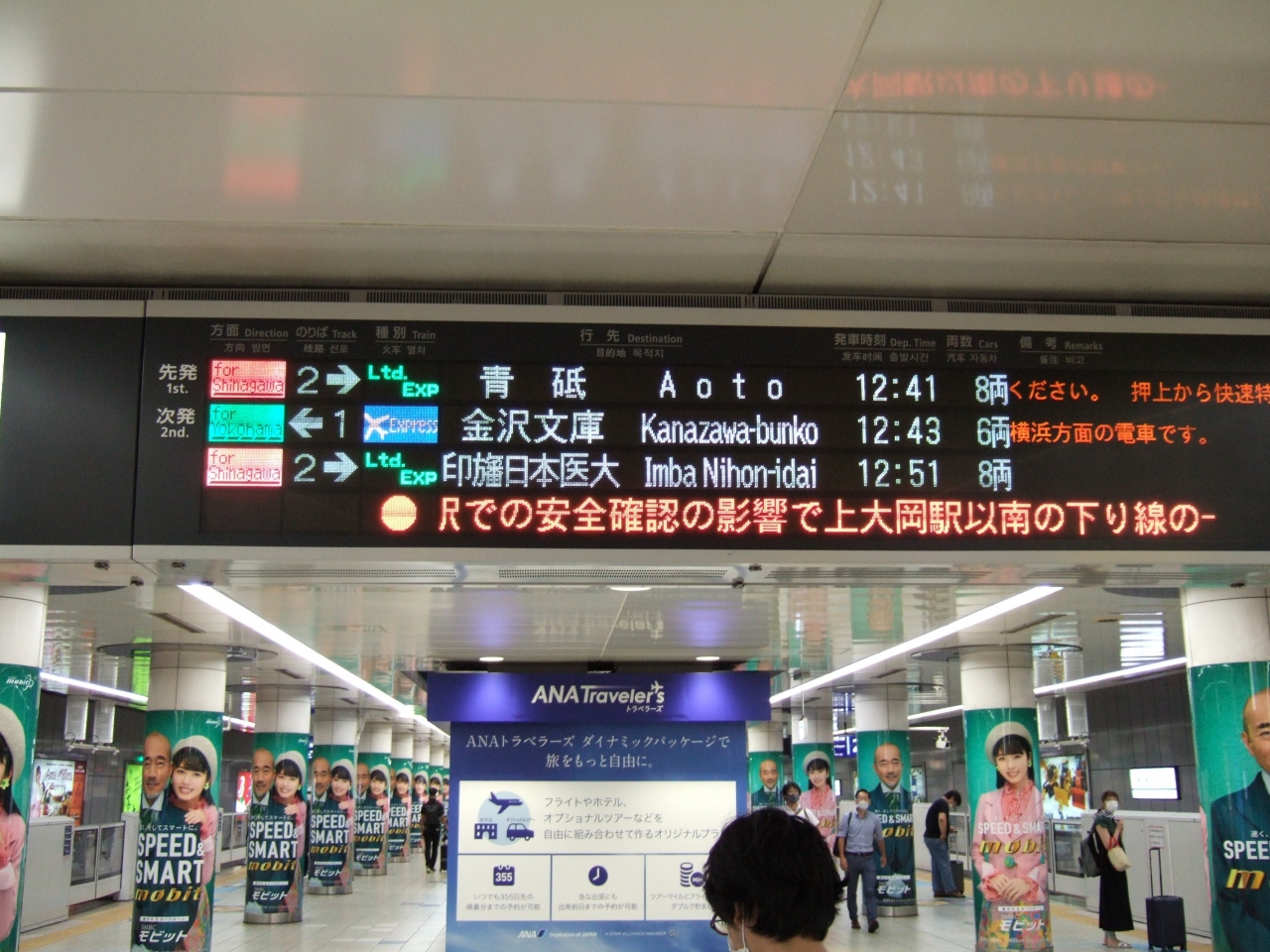 8月下旬の金曜午後に羽田空港に付き、横浜方面に行こうと京急の駅に下りると、なんとエアポート急行は金沢文庫行き。どこかの駅で安全確認のためダイヤが乱れていたようですが、行先を変更したのか確認するのを忘れました。ぎりぎりに折り返し列車が入ってきましたが、定時で出発したのはさすが京急です。