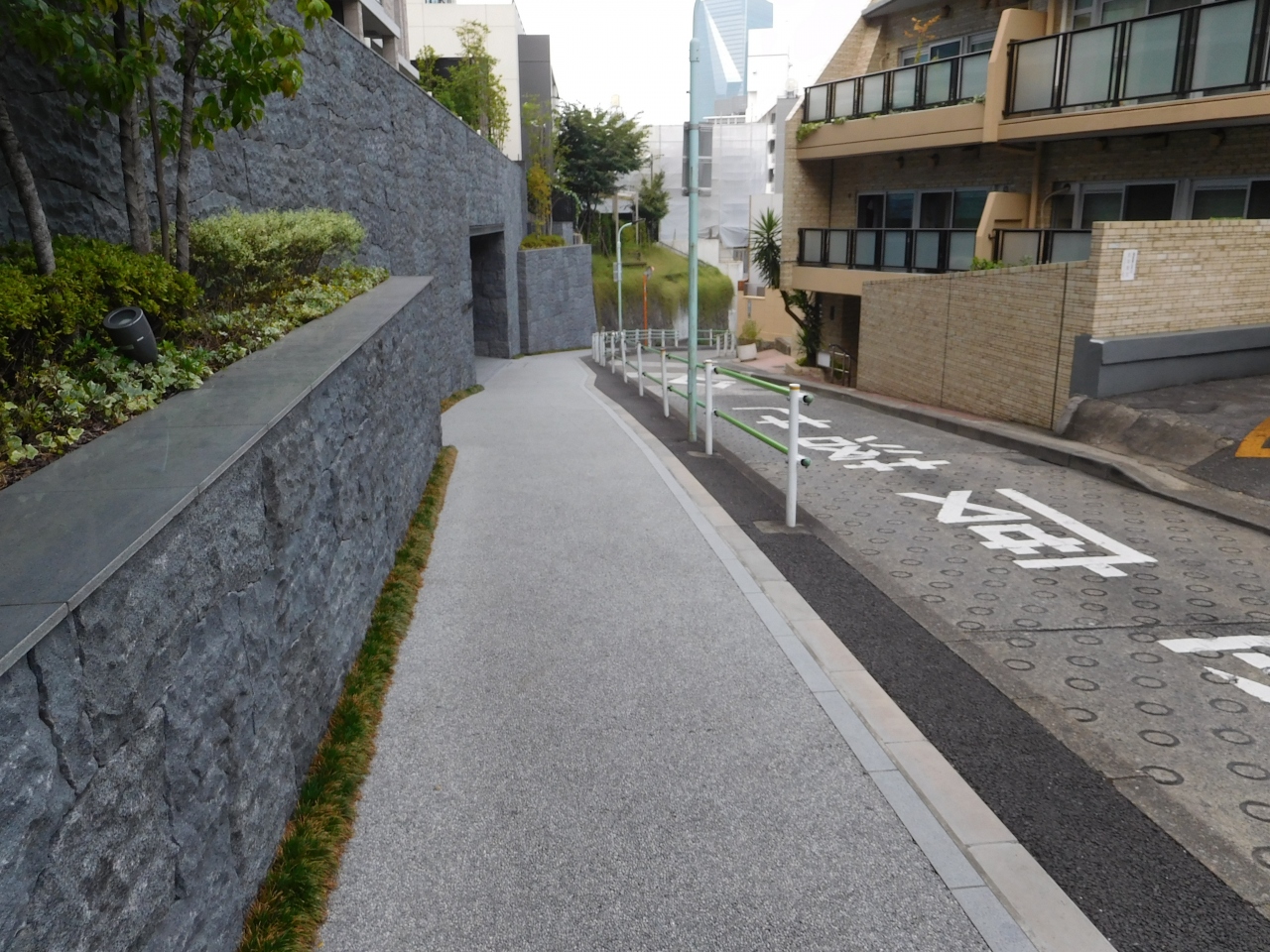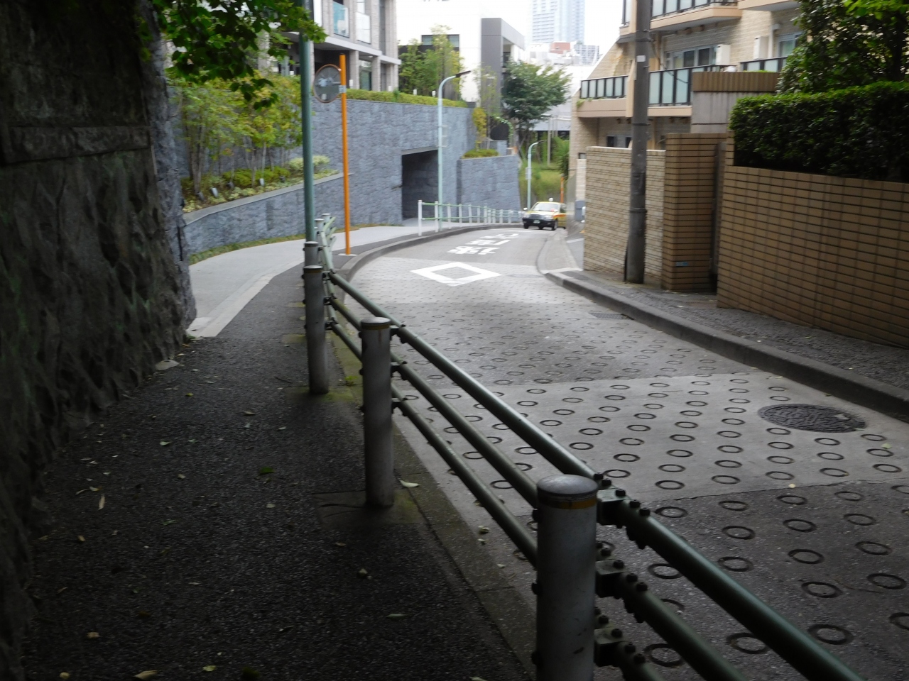 麻布十番には数多くの坂道があり、「暗闇坂」もその内の一つです。大黒坂に通じる一時停止の場所では、木々が生い茂って薄暗くなっていましたが、そこを過ぎると、オーストリア大使館があったり、建物で綺麗に整備されている感がありました。一方通行で、結構急なカーブの坂道の為、道路にはすべり止め加工がされていました。車が通る時は結構続いて通り、抜け道のようになっている感じがしました。