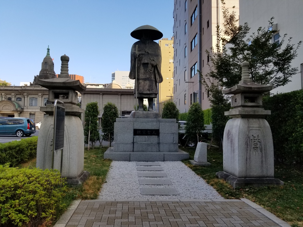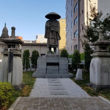 築地本願寺にある親鸞聖人像。 本願寺の隅っこにあるため気づかないかもしれない。