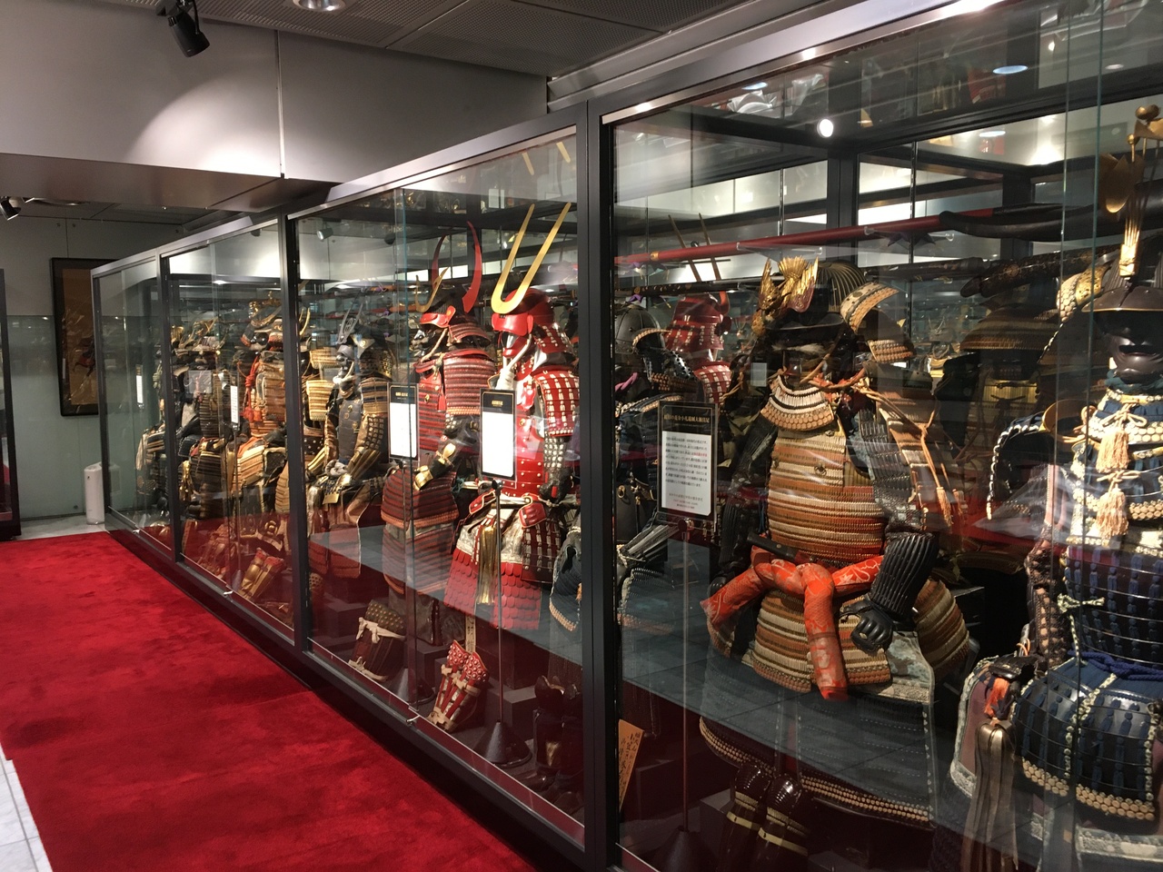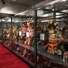 特に受付などもなく入室。入り口からそんなに広くない展示室の壁面にはびっしり武将の鎧が、中央は刀剣が展示されていました。