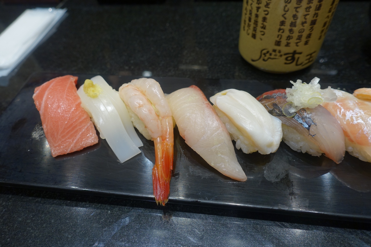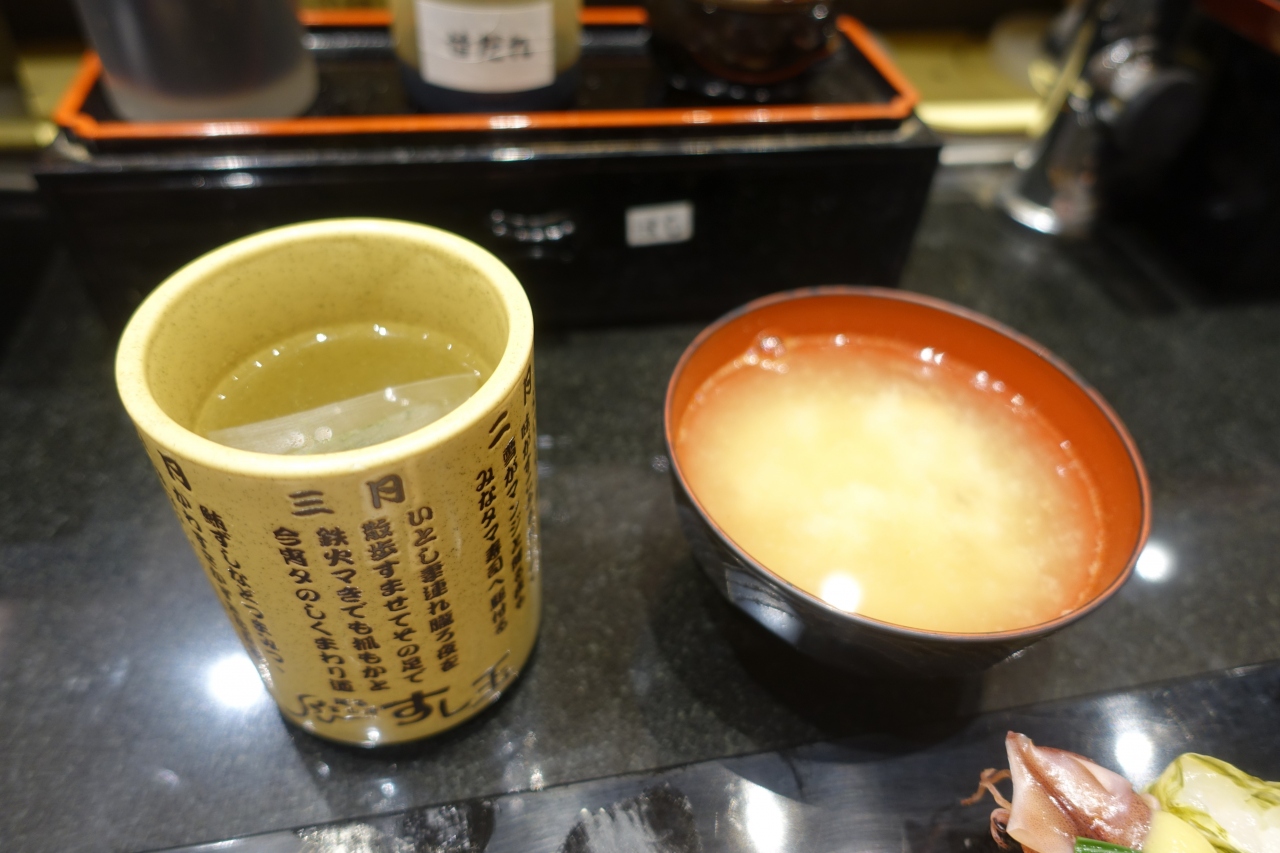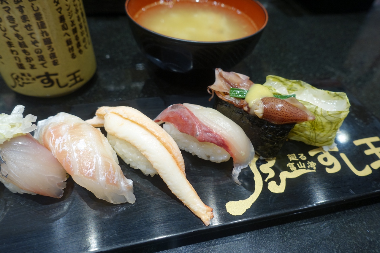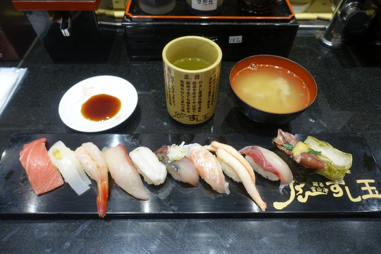 にぎりは1皿100円(税別)~700円(税別)まで細かく区分されてます。あと五種盛り、七種盛りなどセットになったものもありました。富山らしい白えびやホタルイカがセットになった 朝とれ地物盛り11貫(1,500円税別)と後から追加でいくら(330円税別)を1皿注文。味噌汁はセルフで自由に飲めるようになっていました。おいしいだけでなく入りやすいという点でもおすすめ。並ぶ可能性があるのでそこだけ注意です。