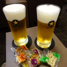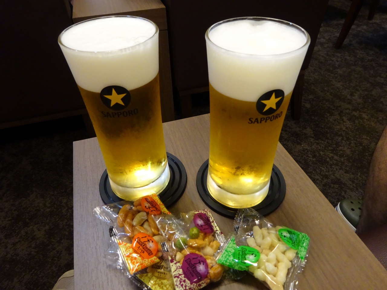 こちらのラウンジでは、生ビールやスパークリングワインも頂けて、飲み物に合わせたおつまみも出て来ます。