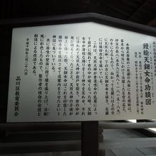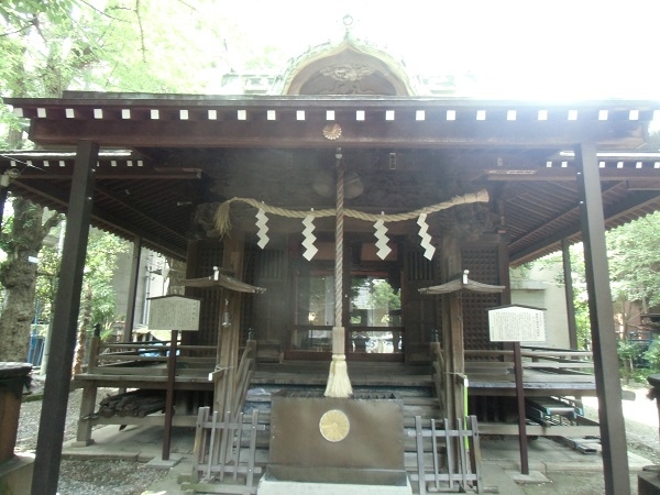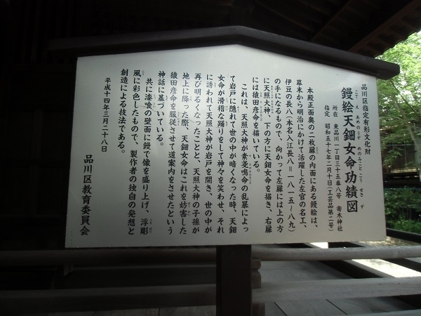 本殿正面奥の二枚扉の内面にある絵は「鏝絵天鈿女命功績図」といって品川区の指定有形文化財です。