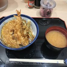 若干メニューは異なるものの、てんや名物?のワンコイン天丼は販売中。海老、きす、イカ、かぼちゃ、いんげんが入って500円は市中と同じ価格であり、羽田空港では嬉しい。