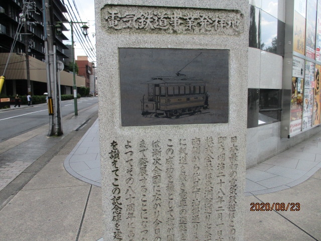 JR京都駅の北側の交差点に碑があります。わりと大きくて気が付く人が多そうです。明治28年から昭和45年までこの地から伏見まで路面電車が走っていました。
