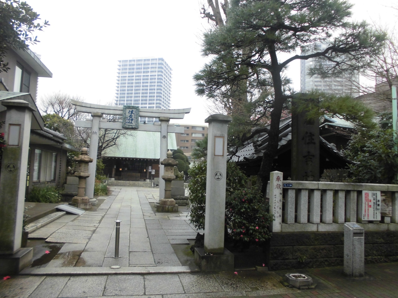 佃島にある神社です。駅だと月島が最寄となります。この辺りは下町で古くからの住宅地があり、その中に神社があります。ところが、数百メートル先には高層ビルが立ち並んでいて、大都市の中にあるのんびりした地位と言うアンバランスさも楽しめます。画像を見るとその違和感を感じていただけると思います。