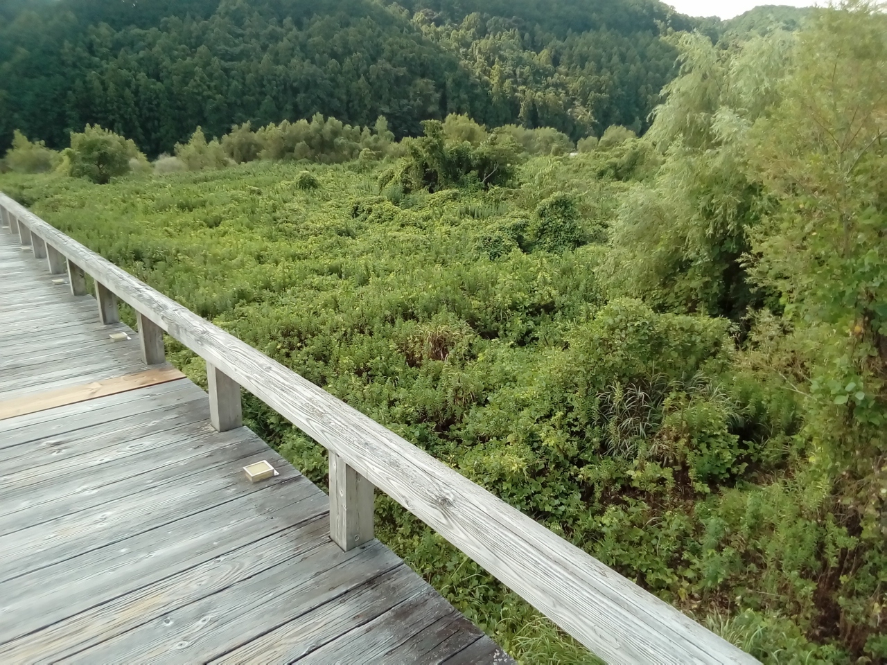 橋からは、渡るにつれて、いろいろな景色がみられます。同じ川の景色でも、流れが速いところ、遅いところ、池のようになっているところなどいろいろ見られます。最後の方まで渡ると、ジャングルのように木が茂った景色にも出会えます。