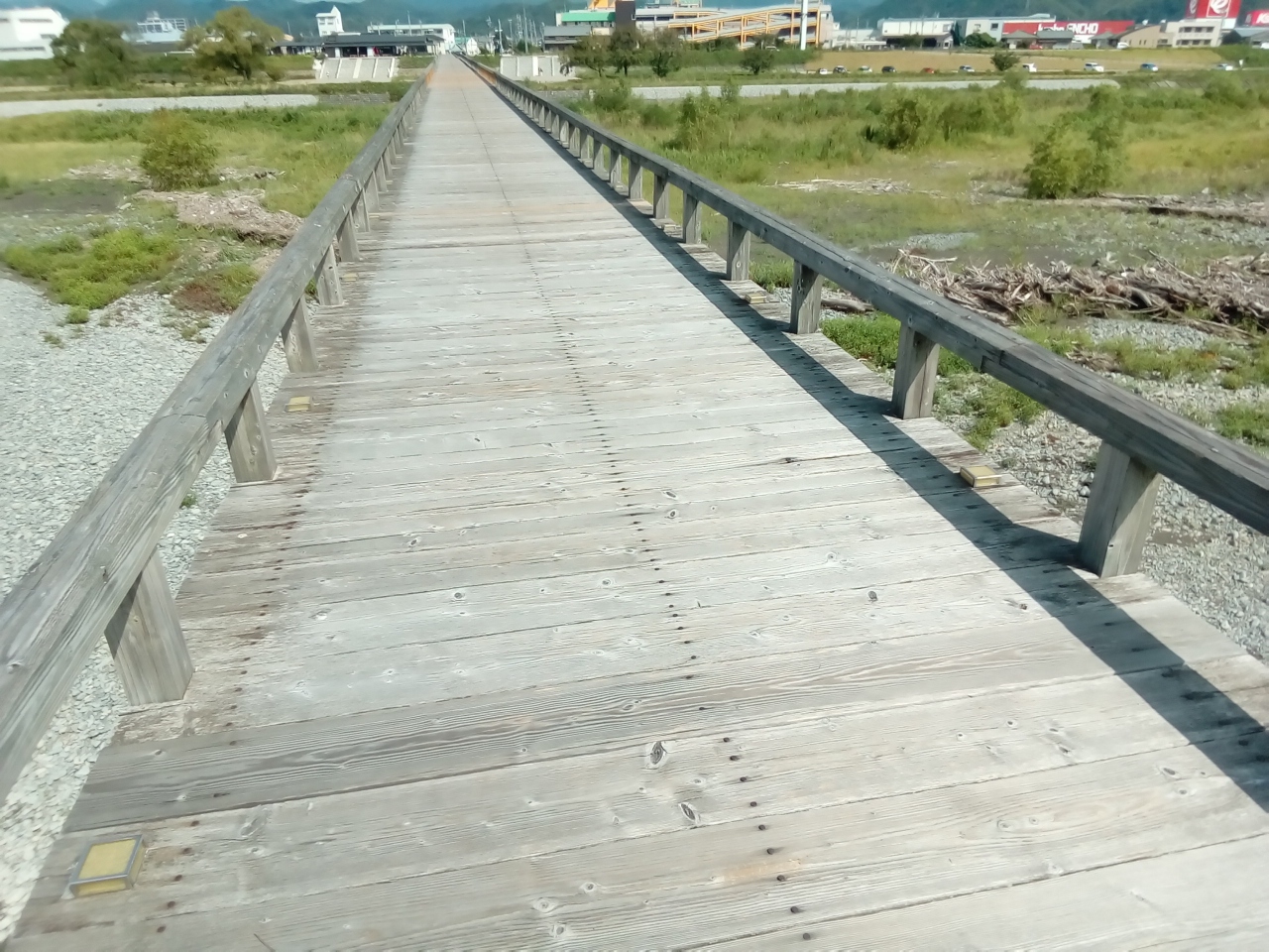 島田駅南口から徒歩15~20分くらいで蓬莱橋につきます。受付で100円払うと、チケットがもらえるので、それをもって橋を渡ります。木造ですので、きしんだりしますが、それもこの橋の味です。ところどころ、新しい木で直したところもあります。