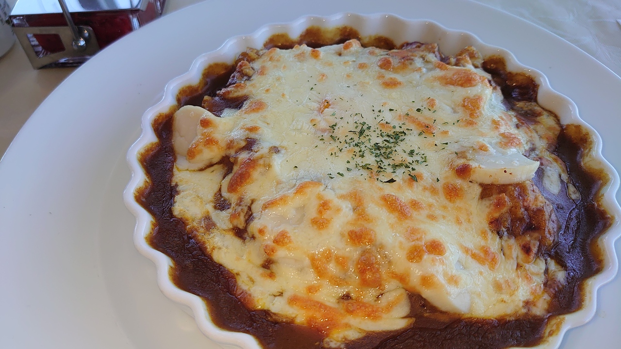 ホテル併設のレストランのようで、一番目立つ建物です。主にホタテを使った料理をいただけます。焼きカレーがおいしそうだったのでいただきました。大きめのホタテがたくさん入っていてボリュームもじゅうぶんでした。