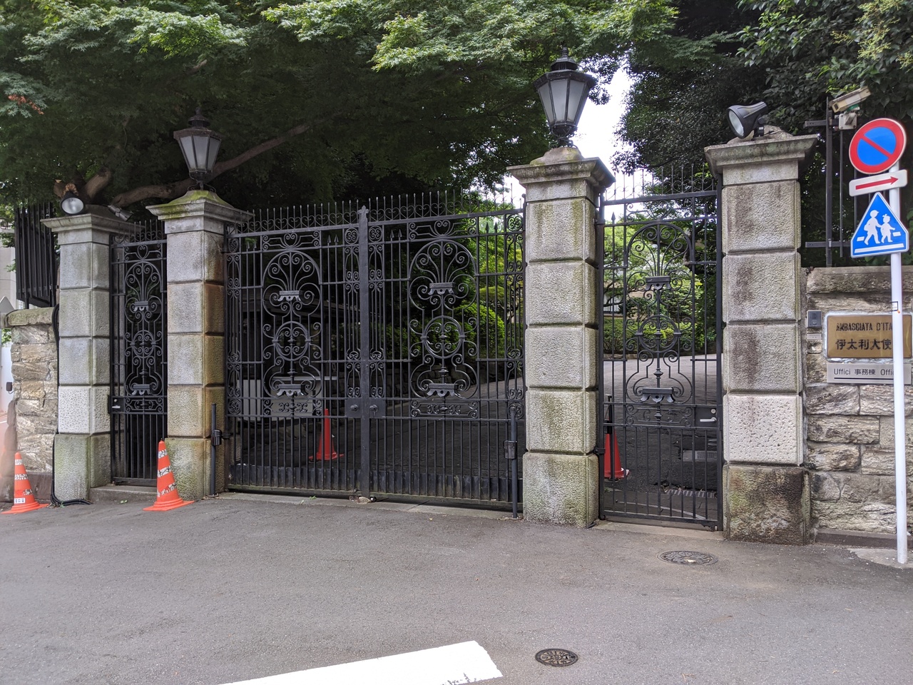 田町駅から歩いて10分程、桜田通りから少し入った閑静な高級住宅街にイタリア大使館はありました。かつて、この場所には旧伊予松山藩の中屋敷があり、歴史的には忠臣蔵で知られる大石内蔵助良雄の息子である大石主税ら10名が切腹した場所としても有名なようです。広い敷地に大使館はありましたが、高い塀と木々に囲まれていて昼間でも薄暗い雰囲気の場所で寂しい感じでした。