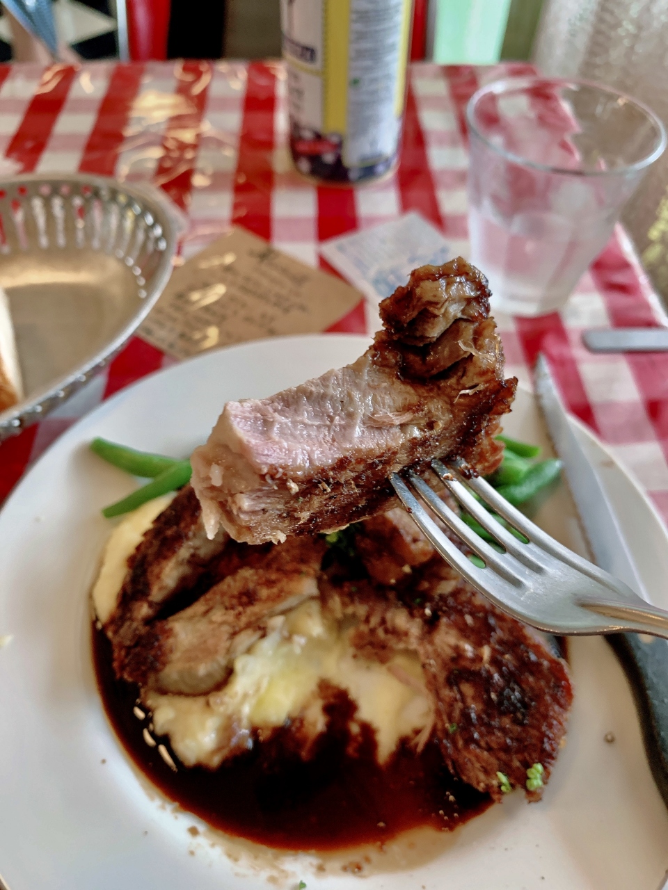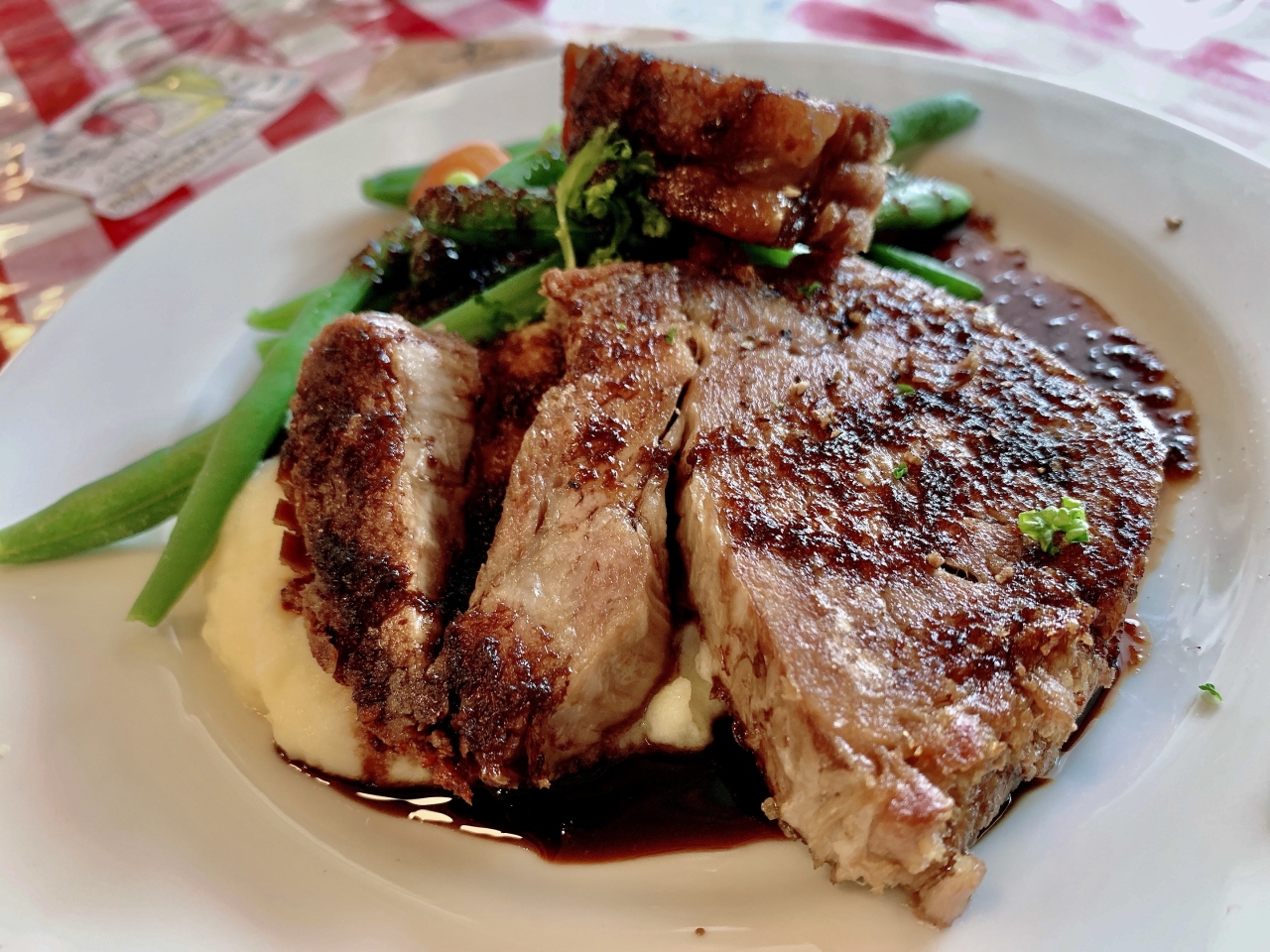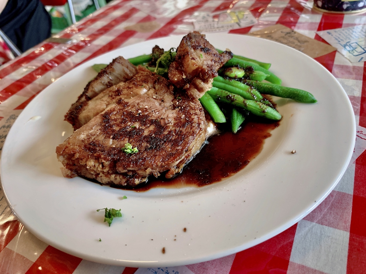 しばし待っての配膳となりました~豚肉は分厚くコロってするくらいの大きさで!予めボイルされカリカリにソテー仕上げ!そしてバルサミコソースがたっぷりとかけられています~盛り付けもラフな飾らないバサッとした感じが「大衆食堂」っぽくて良いですね・・・ナイフを入れて切るというよりナイフとフォークでホロっと解ける柔らかさは手間暇の証だろう~ただ味付けは薄く感じたな~「バルサミコソース」も想像した好みのタイプでなかったのでイマイチな満足感で不完全燃焼でした。