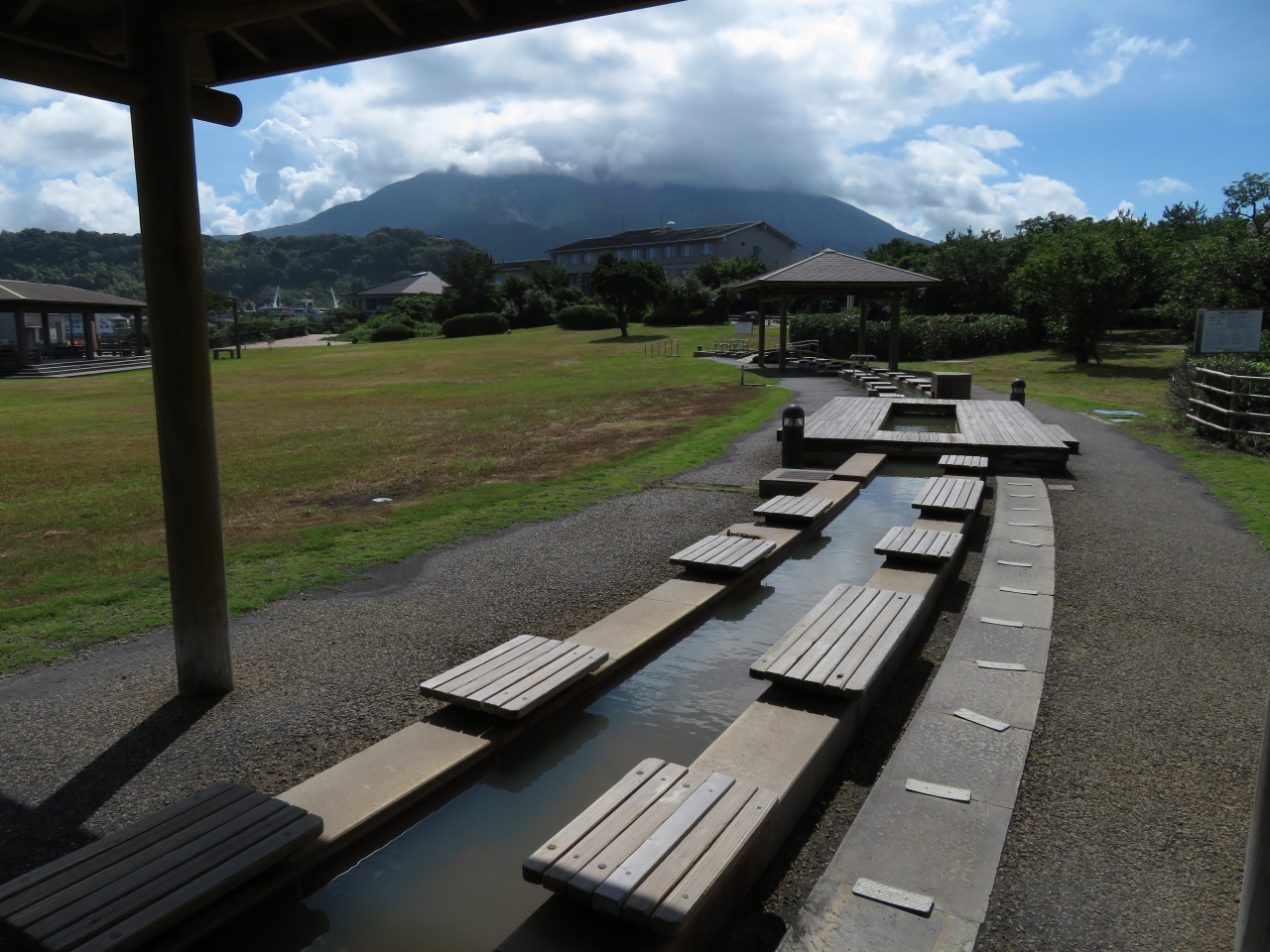 公園の背後には迫力ある桜島を見る事ができます。桜島を背に天然温泉の足湯に浸かってみたかったのですが、30度を超える暑さの中では熱中症になる恐れがあり、今回はやめておきました。