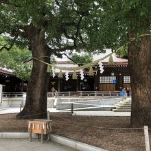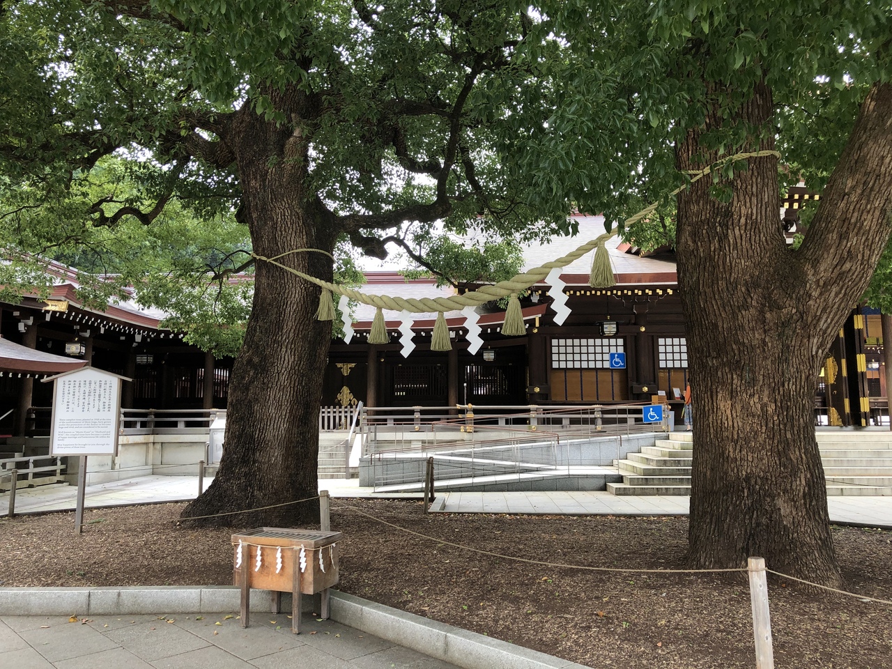 本殿を正面に立つと両脇に大きな楠木が立っているのが分かりますが、その左側にある楠木は2本あり、それらを総称して「めおとくす」と呼んでいます。縁結びや家内円満等を祈願する方が多いようで、楠木の前には賽銭箱が置かれ、参拝者が見られました。青々と葉を茂らせた楠木はとても元気なようで、自らもそうでありたいと思った次第です。