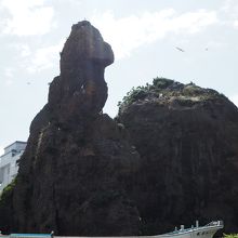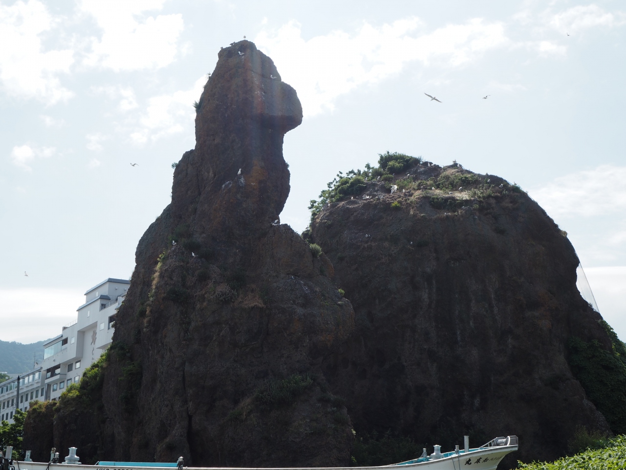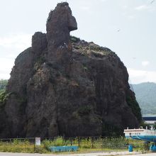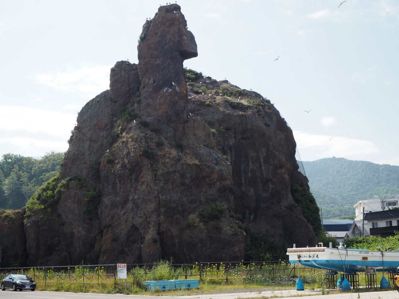 ゴジラ岩はウトロの街からウトロ港へと歩いて行くと見かける岩です。近くにはオロンコ岩もあります。ゴジラ岩は高さ10メートルほどの岩で、見る角度によっては、上部はゴジラの口、顔のようにも見えます。岩山で落石もありそうなので、近くには立ち寄れないようになっていました。ゴジラに似ているかは面白半分に見るに限る感じです。
