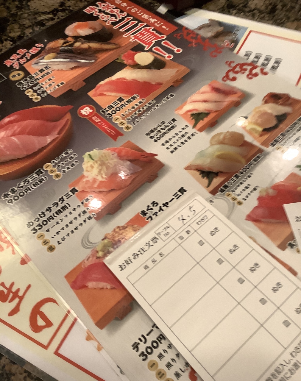 回転寿司ですが混んでるお昼時に乗ってたお皿が残ってるだけで他はお品書きが回っててメモに書いて注文するようになってました。
