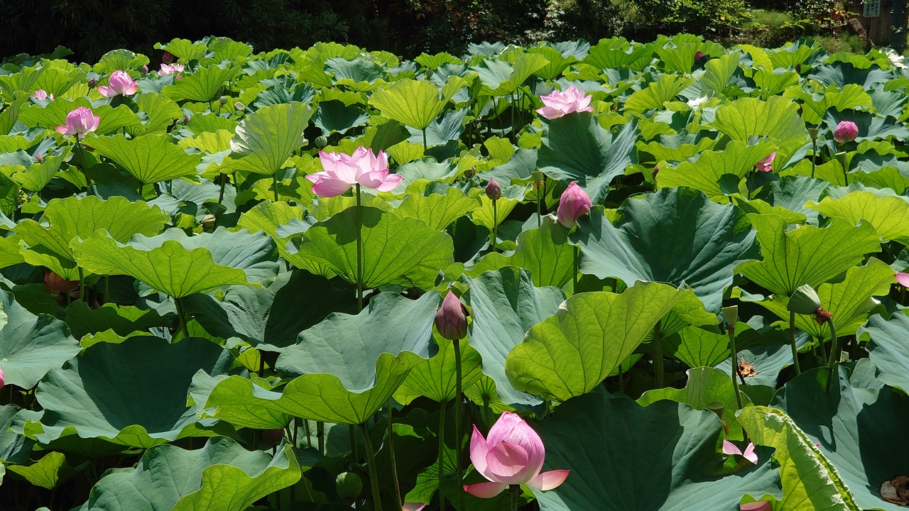 蓮を見られるとのことで行ってみました。濠に葉がぎっしりと敷き詰められたような感じになっていて、間から可憐な花が見えました。予想以上にしっかりと咲いていて結構見ごたえがありました。暑い夏の松が岬公園の楽しみ方です。