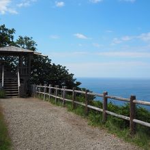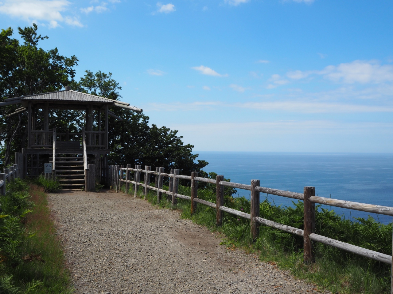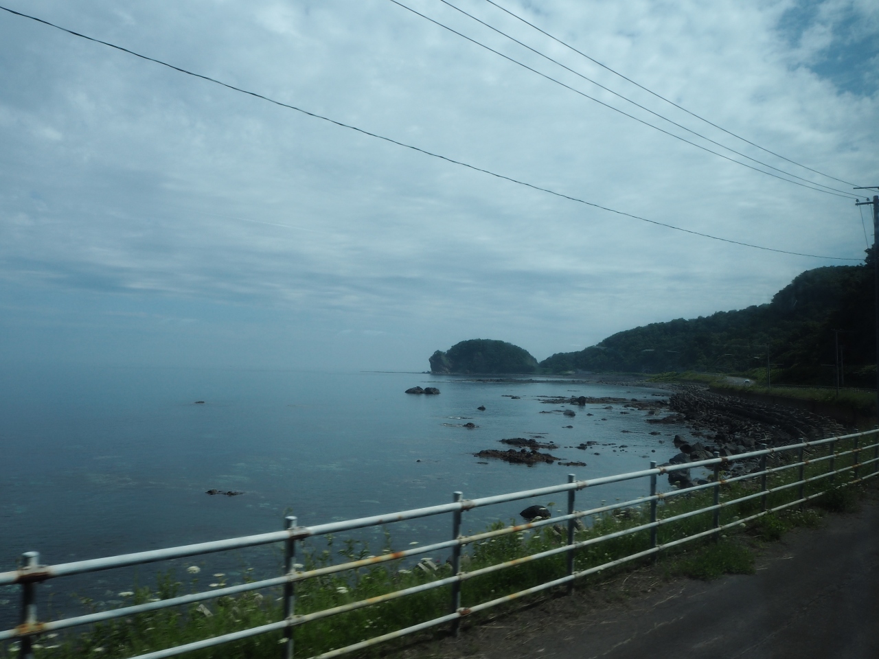 オホーツク海岸にのびた知床半島の海岸線が知床海岸です。知床海岸は断崖の絶壁が続き、知床の山々が迫ってきています。冬場から早春には流氷が一面を覆う知床海岸ですが、夏場は青い海がきらきらと輝いていました。波静かな海でした。道のカーブの場所に立つと、遠く知床半島の先端の方も見えました。、