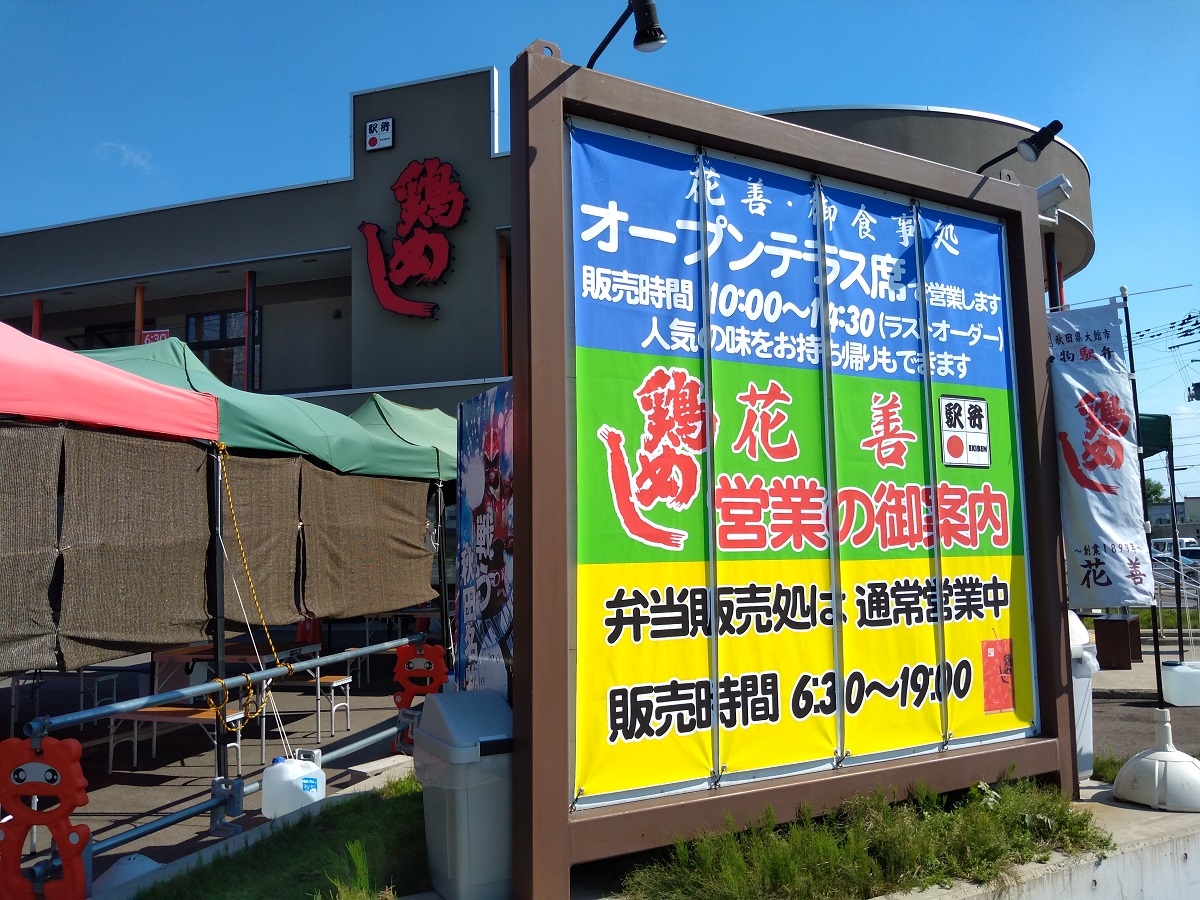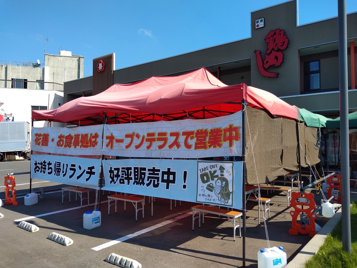 駅弁で不動の人気を誇る花善の「鶏めし」。その駅弁工場に併設されたレストランがあり、鶏めし御膳や鶏めし出汁茶漬けなどが楽しめていた。しかし、コロナ感染拡大対策としてテイクアウトのみの営業となり寂しい思いをしていたが、風通しの良い駐車場をテラス席としてレストラン営業を再開していた。