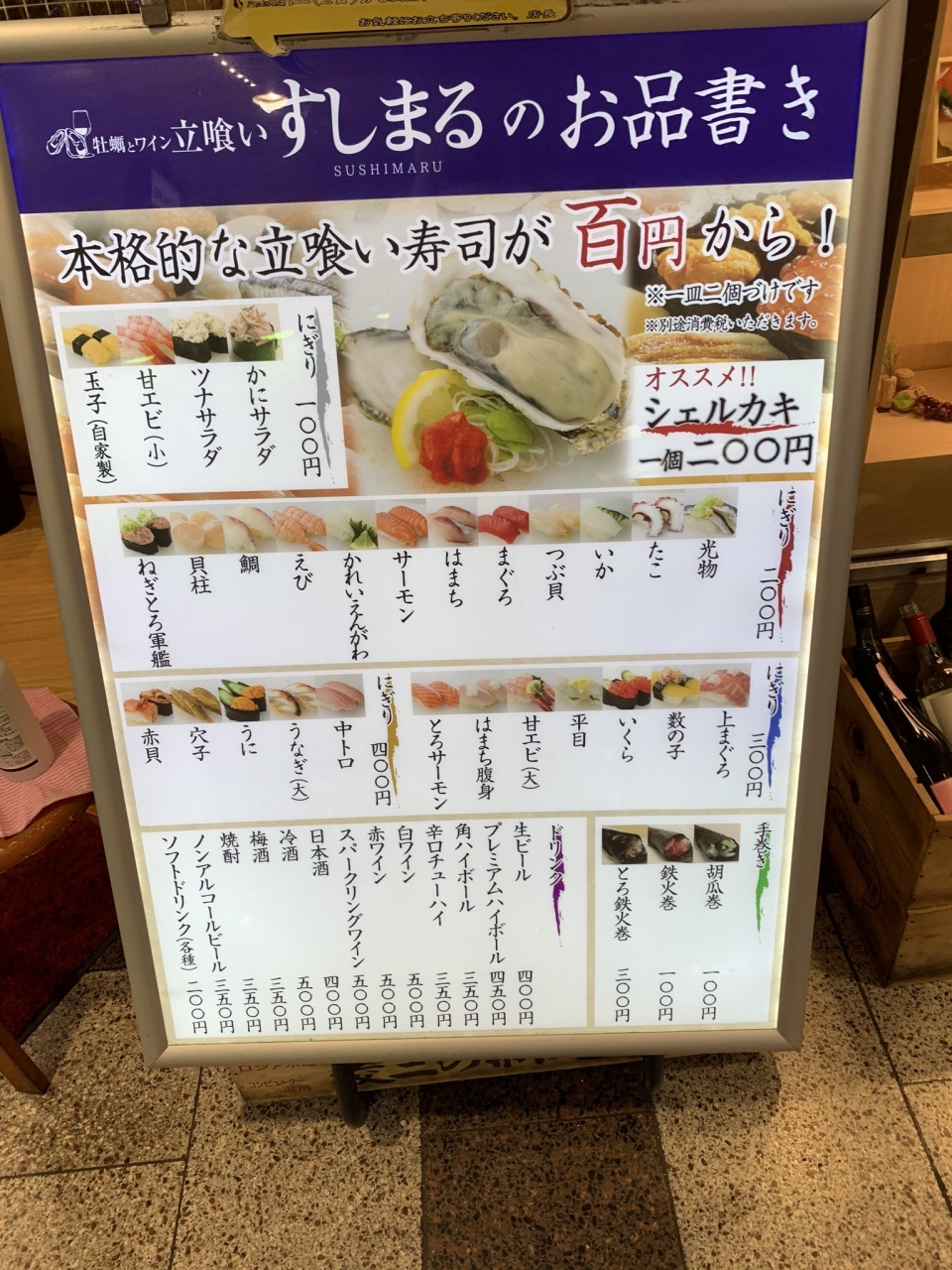 大阪 「 阪急百貨店」の近く「阪急サン広場」にある 【 すしまる 】 は 立ち食いのお寿司屋さん。