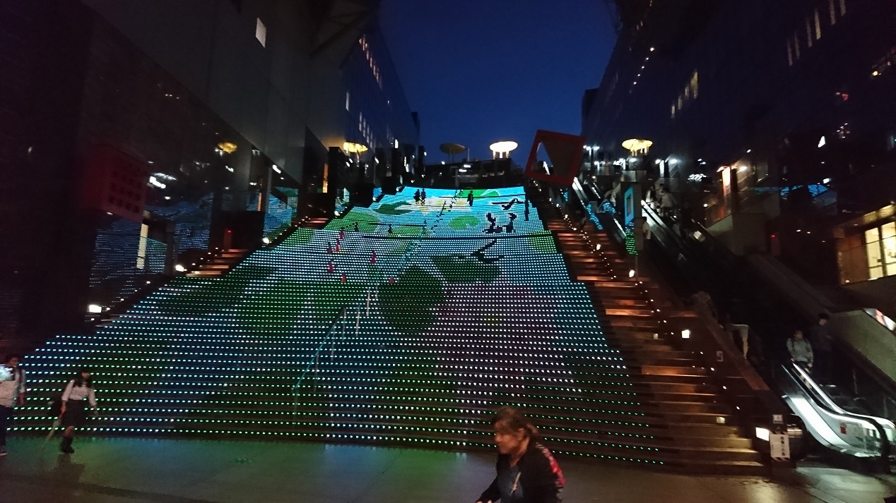 京都駅ビルの大きな階段で行われるイルミネーションショーがグラフィカルイルミネーションです。2018年6月の京都観光時の夕食後にイルミネーションショーを楽しみました。階段を使用しているせいか?立体感が有って素晴らしい眺めでした。