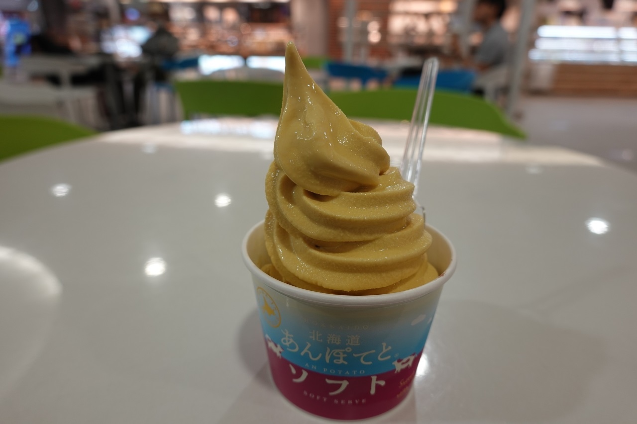 空港2階のJALカンターに近いところにあります。こちらの「北海道あんぽてとソフト」は、新千歳空港ソフト・アイスクリーム総選挙2019で第3位を獲得したので、注文することにしました。盛り付けはコーンとカップが選べ、今回はカップにしました。クリームを一口食べると、サツマイモの香りが口一杯に広がります。食べ進めると、下の方にはアンコが入っていました。このアンコは甘みが強いです。コーヒーや牛乳と一緒にいただくのが良いのかもしれません。