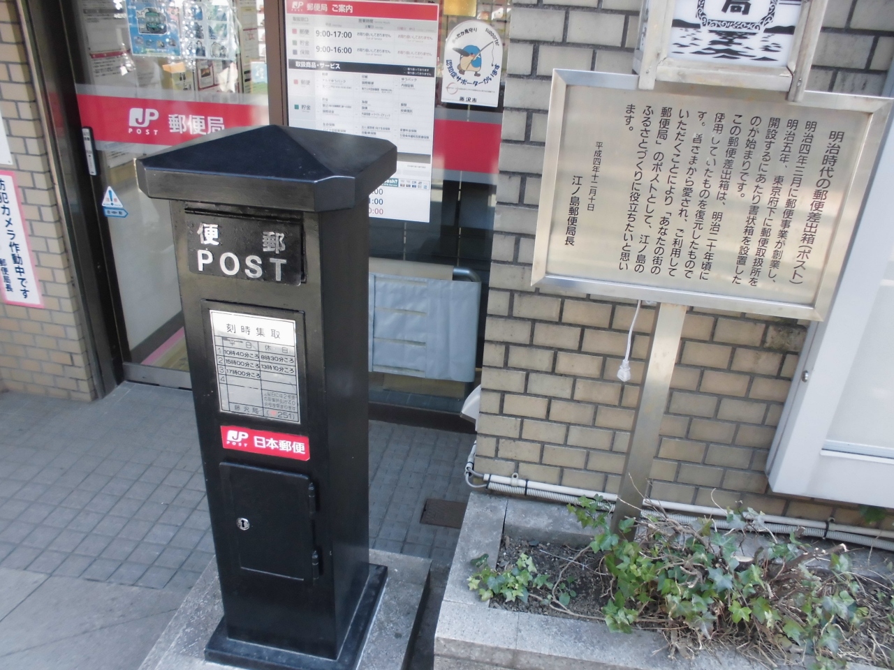 江の島の商店街の郵便局にあります。明治時代のを復元したそうです。古い郵便ポストと言えば赤い円筒形のイメージでしたが、さらに古いのは黒いものなんですね。でも江の島の観光スポットを考えたらこういうポストのほうが似合っているのかもしれません。