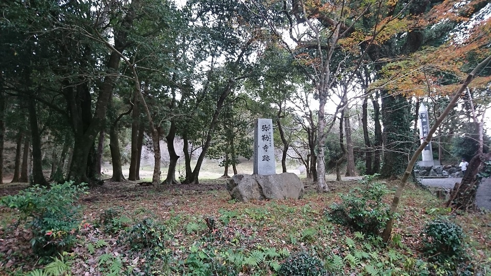 大分県宇佐市に鎮座している宇佐神宮の呉橋近くに弥靱寺跡の標柱が立っています。天平9年(737年)に創建され、明治時代の神仏分離令によって宇佐神宮から分離されるまで存在していた弥靱寺が建っていた場所です。現在では空き地のようになっていて、建物の跡と思われる礎石が数か所あるだけでした。