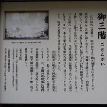七日町通り沿いにある阿弥陀寺の境内の中に御三階があります。鶴ヶ城の本丸に御三階跡がありますが、そこにあった御三階が阿弥陀寺に移築されて残っています。内部を見学することはできませんが葵の御門、唐破風屋根など立派な造りをしています。鶴ヶ城で唯一現存する遺構としてとても貴重です。
