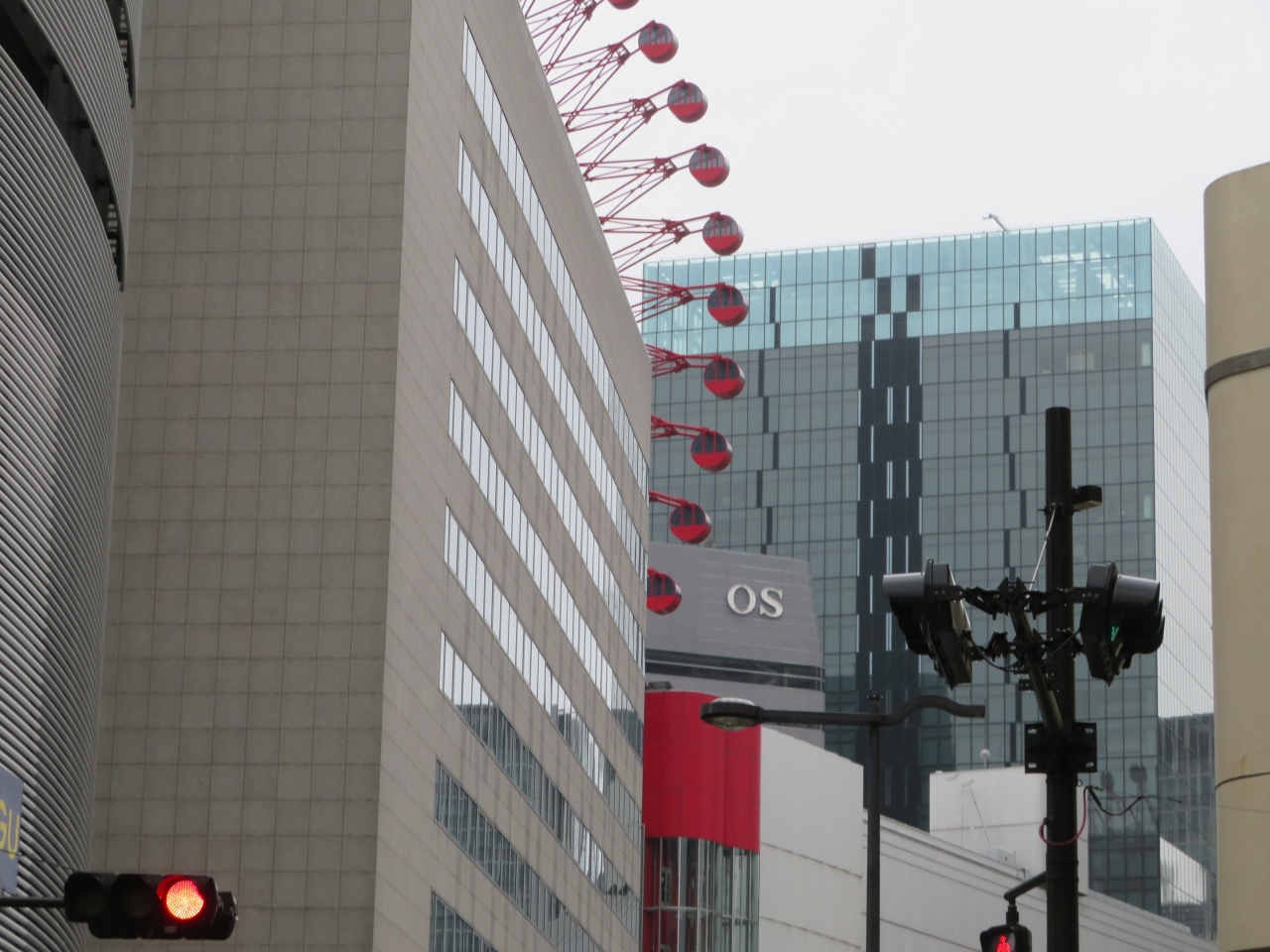 茶屋町の方から眺めると、銀色のビルの上の方に、「OS」の文字が見えます。1Fから3Fは、ナムコが入っていて、大きなゲームセンターのようになっています。やはり外観は先が尖った三角柱のような形をしているので、一見の価値があります。
