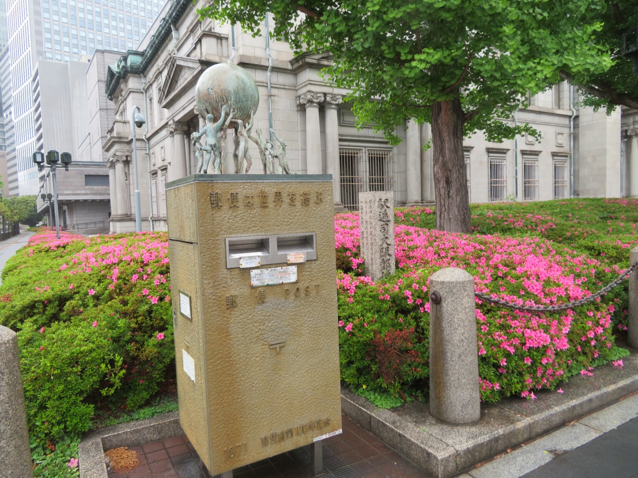 久々に日本銀行大阪支店の前を通りました。その前にこちらの石碑がありました。金色っぽいポストの上にみんなで地球を支えているようなオブジェが乗っています。以前は寂しい雰囲気だと思いましたが、今回通ったのが5月で、金色のポストにツツジの色が映えて綺麗でした。
