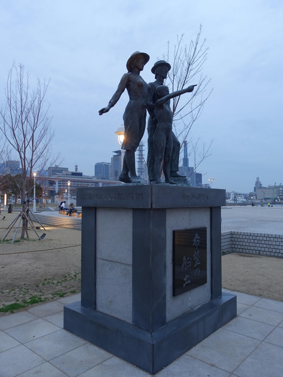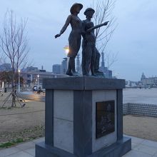 メリケンパークには、数多くのオブジェやモニュメント、像がありますが、その中でもメッセージ性が高いのが「神戸港移民船乗船記念碑」です。台座の部分には「希望の船出」という文字が刻まれています。この場所からどの地へと旅立った人が多いのか、その人たちが送った人生はどんなものだったのかなど、色々な想像が膨らむ像でした。