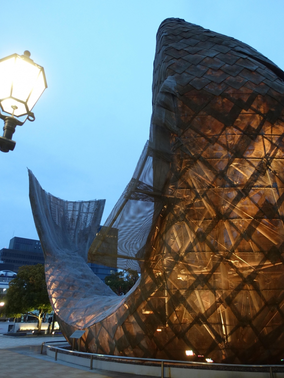 メリケンパークの最北端に位置する大きなモニュメントです。鯉をモチーフに造られており、神戸港開港120周年となる1987年に設置されたということです。周囲が暗くなり始める頃に通りかかったところ、灯かりが灯されており、昼間とは異なる美しさがありました。