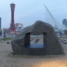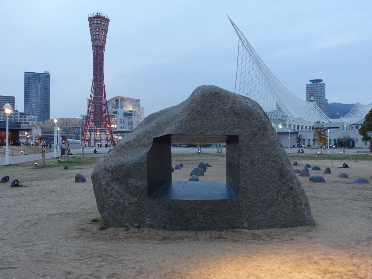メリケンシアターは、メリケンパークの一画にあります。名前からは映画館かと思いますがそうではなく、石を長方形にくりぬいたオブジェです。ここから見る景色が美しいというメッセージを伝えているものですが、確かに絵になる光景がたくさんあります。