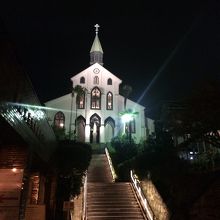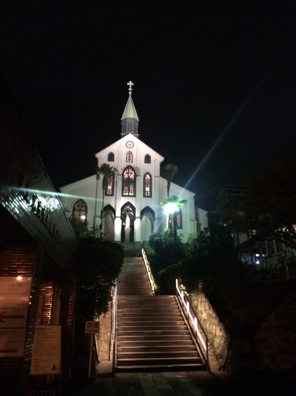 白い壁の教会で、夜空でも目立っていました。夜はライトアップされていました。2階部分にあたる窓枠が大変おしゃれでした。敷地内は禁煙で、入口を入って長い階段をのぼっていくと教会前に像が立っています。漢字で天主堂と書かれているのが日本ぽいです。