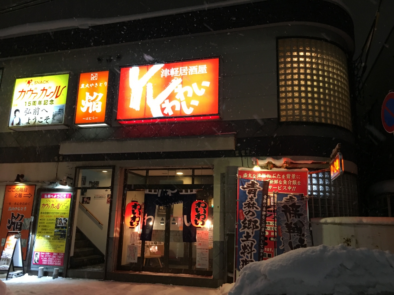 JR弘前駅からも近い居酒屋です。カウンターにテーブル席、小上がり席もあります。メニューは充実しており、津軽の郷土料理の名物もそろっています。しんしんと雪が降る中、町は静まり返っていましたが、店内は観光客でにぎわっていました。