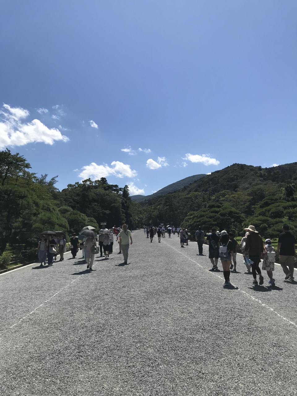 8月に行きましたがとても暑かった。宇治橋からの参道は日影もなく照り返しがあるのでとても暑いですが、宇治橋からすぐのところを右に入る五十鈴川よりの道は木陰が多く暑さをしのいで歩けます。熱中症対策には日傘がおすすめです。