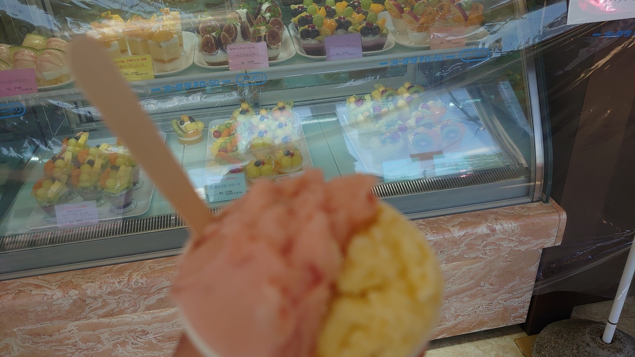 フルーツの他、フルーツを使ったケーキやジェラートが販売されています。ジェラートをいただきました。さっぱりした夏にいいお味でした。ケーキもフルーツてんこ盛りで目を奪われたのですが、イートインができなかったので断念しました。