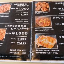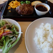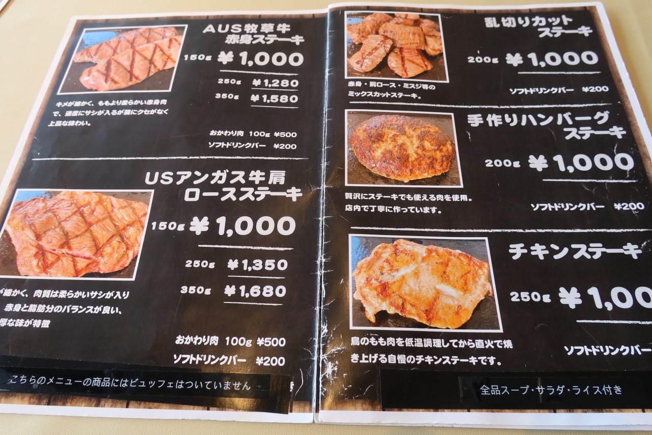 ステーキ食べ放題メニューが売りですが、単品メニューもあり、今回は乱切りステーキを食べようと思ったのですが、お昼なのに何故か売り切れ。仕方なく、ハンバーグを頂きました。200gのハンバーグはミニサラダ、スープ、ライスが付いて1000円とコスパが良いですが、味はファミレスと同じ。スープ、ライスはお替りが無料で出来るのは嬉しいです。