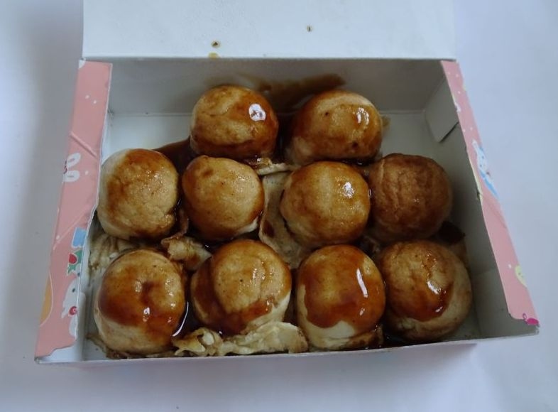初めてマヨタコを購入。見た目、たこ焼き。上にソースが塗られているだけで、寂しい感じ。でも、中にマヨネーズが入っていて、追いマヨネーズ・ソースしなくても、このままでいけちゃいました。