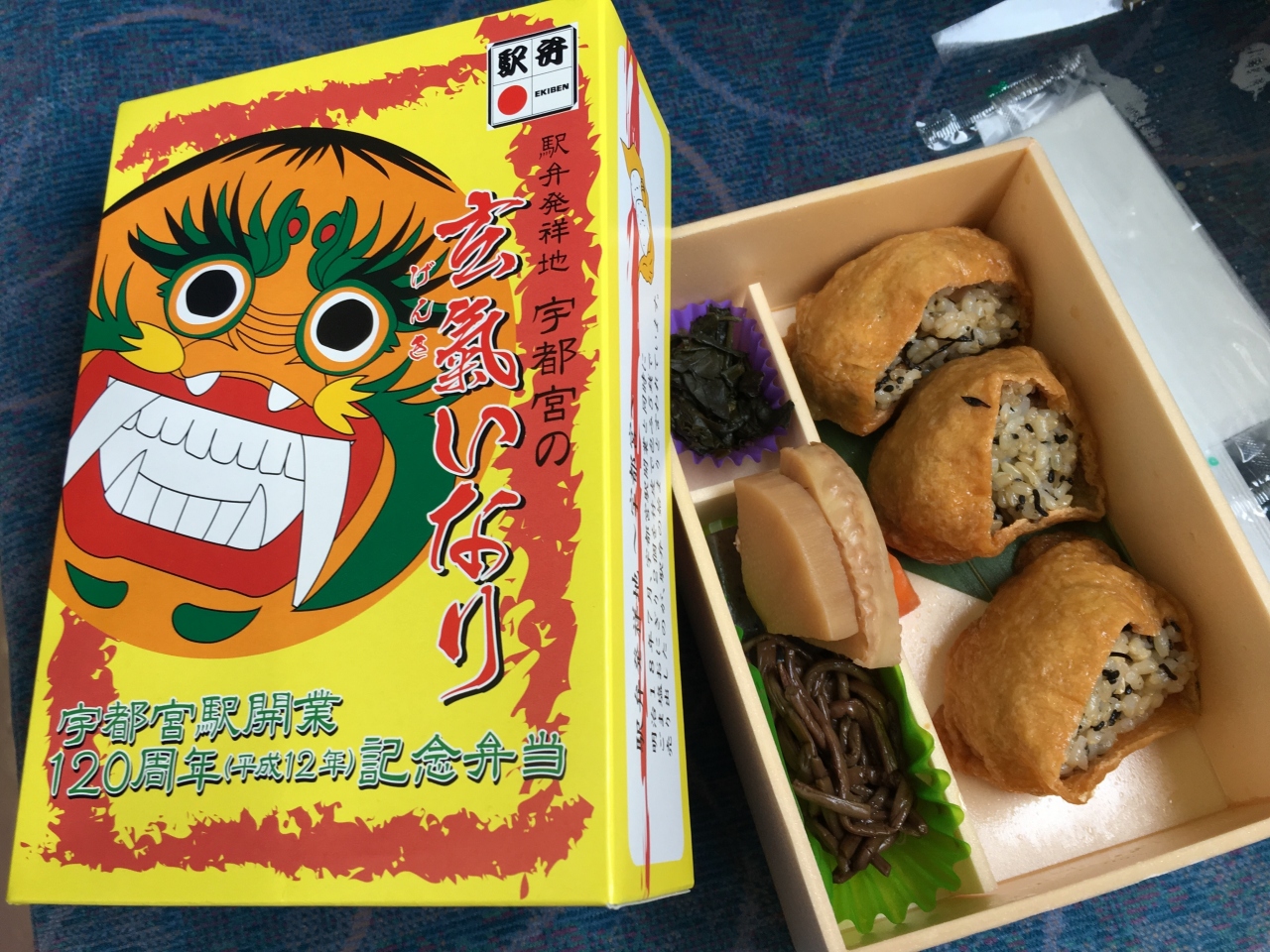 宇都宮の駅弁業者さんで、宇都宮駅改札内に駅弁売店があります。栃木の素材を使ったラインナップです。もう8年も前に発売された宇都宮駅開業120周年記念のお弁当がまだ売られていました。玄気いなり、一口サイズのいなり寿司です。