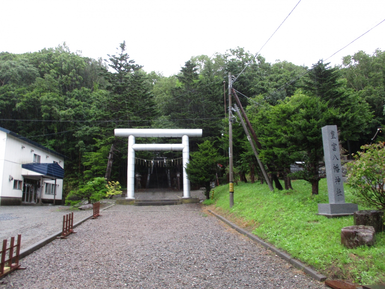 JR豊富駅から徒歩5分程度のところありました。列車の待ち時間にどこか見学できるところはないかと探していたら見つけました。国道40号沿いの丘の上にある大きな神社でした。足を踏み入れると砂利の参道があり、入口のところに白い鳥居がありました。右に大きい開拓記念碑があり、左に社務所がありました。