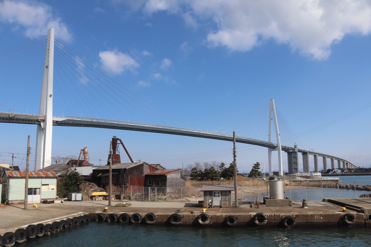 富山新港の入口にかかる大きな斜張橋です。日本海側最大の二層構造で車道の下には歩道もあり、雄大な景観を楽しみながら渡ることができます。帆船海王丸や構内のキリンクレーン、町並み越しには立山連峰を眺めることができます。