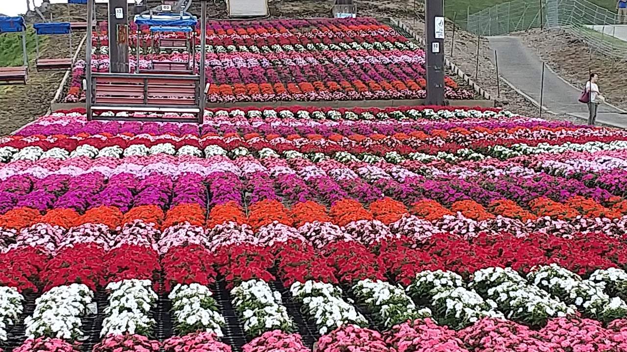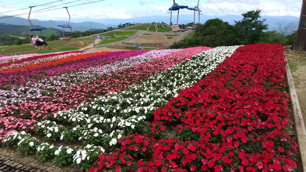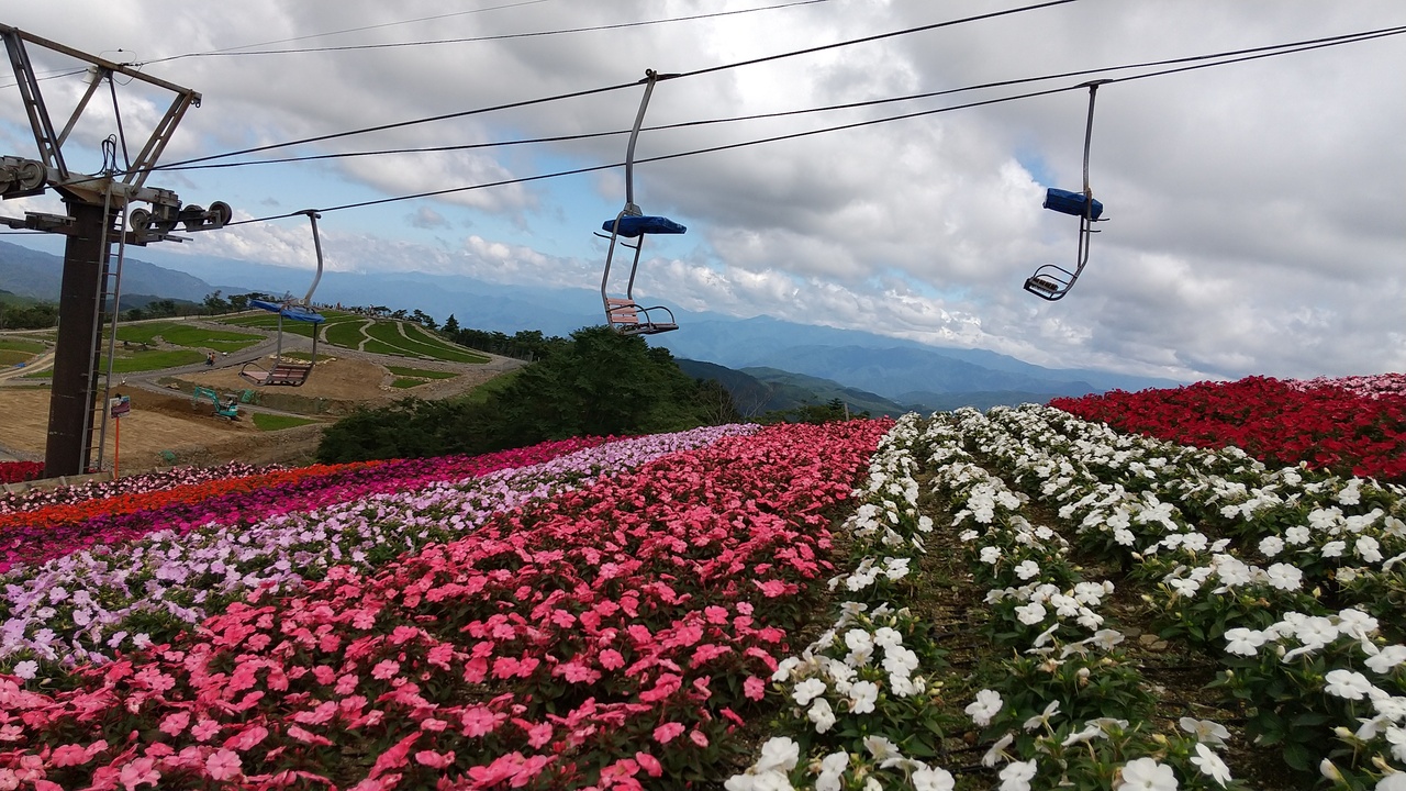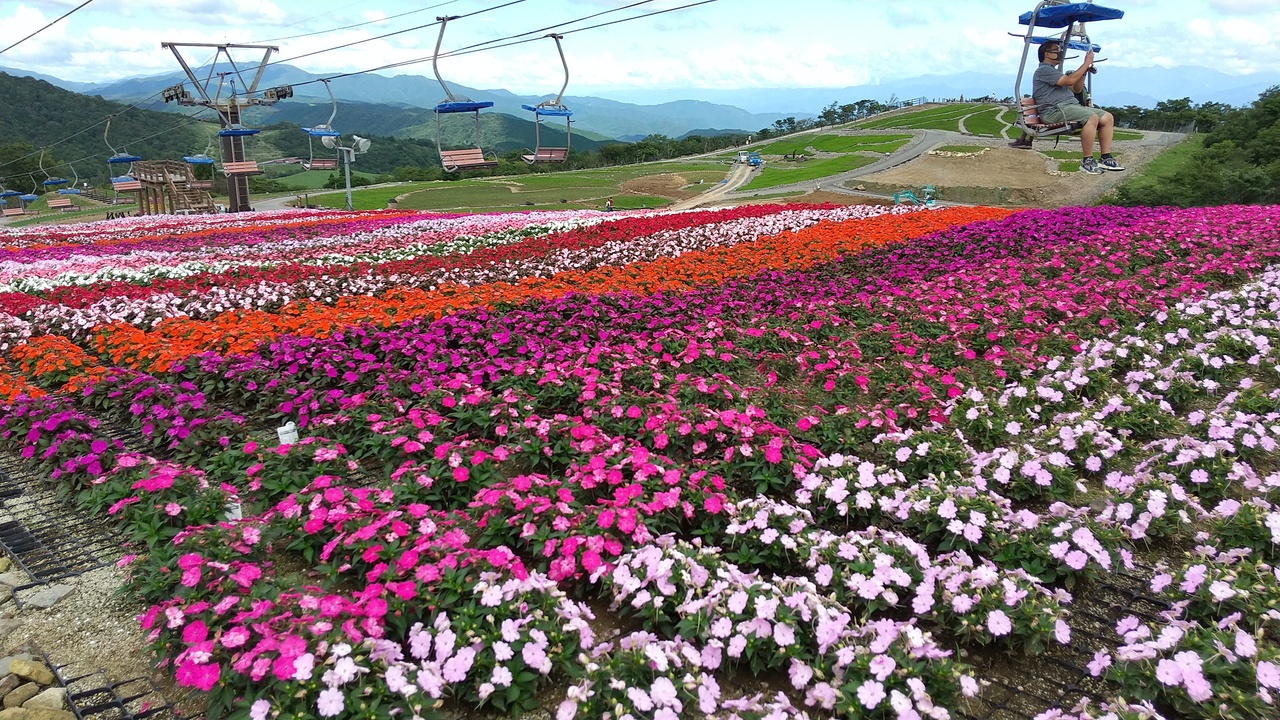 リフトに乗り頂上に向かうと、夏の花サンパチェンスが色鮮やかに咲き、リフトに乗りお花畑の上を通ります。それほど広くない範囲ですが、生き生きと咲く美しいお花畑は圧巻です。