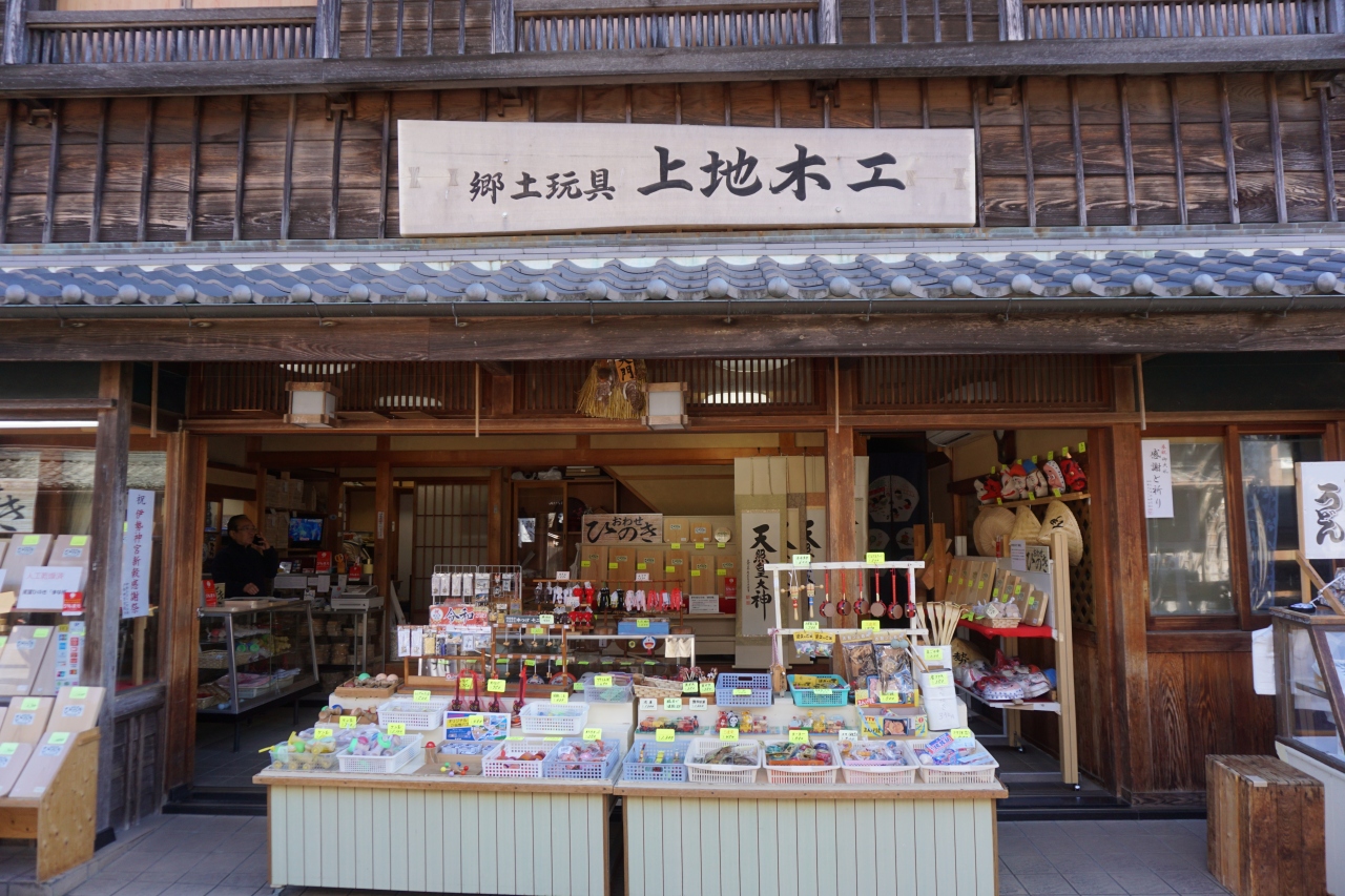 上地木工は、おはらい町。お土産物屋さんといえばおみやげ物屋さんなんですが、コマやけん玉、輪投げなど木工製のおもちゃを多く取り揃えていて、温かみのあるラインナップ。オープンな店構えだし、気軽にのぞけるのもいいところです。
